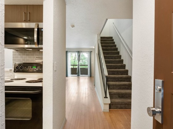 Welcome to this beautifully updated two-story condo offering light-filled, open-concept living. The main level features new double-pane windows and slider, a cozy fireplace, and access to a private deck—perfect for morning coffee. The upgraded kitchen includes stainless steel appliances, quartz countertops, and modern cabinetry. Upstairs are two spacious bedrooms, a primary suite with walk-in closet, dual-sink vanity, and in-unit laundry. Enjoy two reserved parking spaces (one covered), a second patio, and community BBQ area. Enjoy the best of both worlds—tranquil wooded living with easy access to shopping and dining.