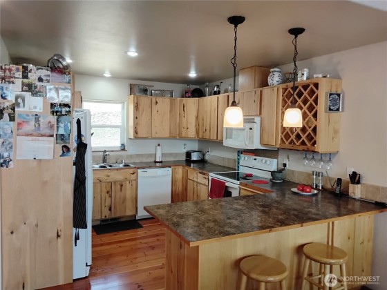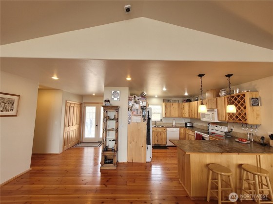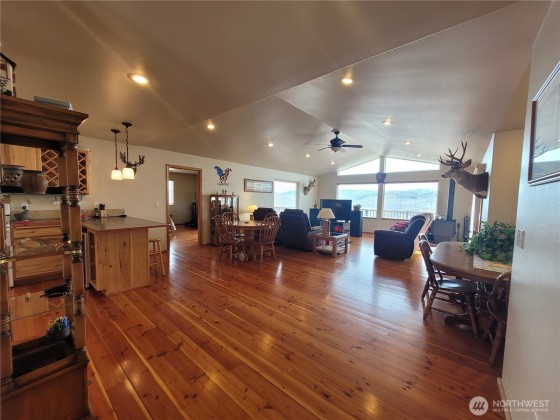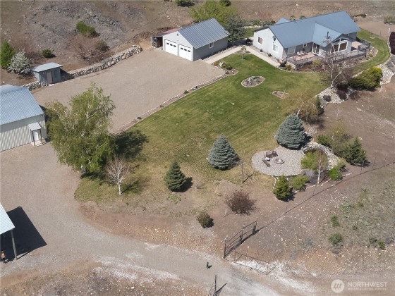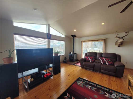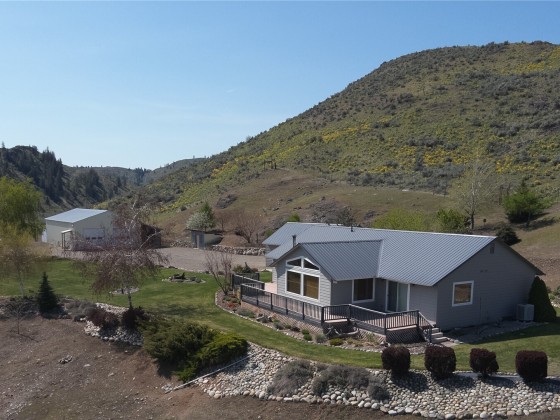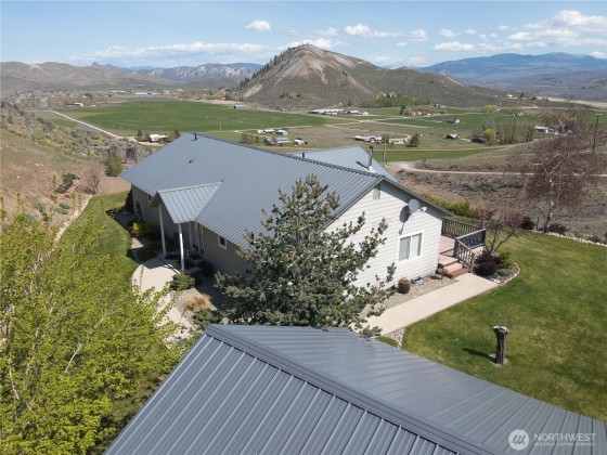 This meticulously maintained home features solid wood floors, doors, and cabinets, vaulted ceilings, recessed lighting, a jetted tub, two walk-in showers & a cozy fireplace. Two sliders open to a full-length deck with panoramic views. Includes 400-amp service, 2-car garage & a 1,760 sq ft insulated shop with 200-amp, car lift, compressor, tool room, office & secured storage. Extras: powered A/C shed, koi pond, fenced garden, fire pit, chicken coop & fenced yard. Borders nearly 2,000 acres of DNR land with stunning views of the Okanogan Valley & Aeneas Lake—just minutes from Tonasket!