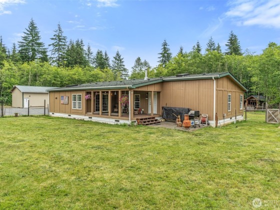All new carpet!! Living room, bedrooms, bathroom & utility room have been freshly painted. Move in ready! Tucked away on 3.69 serene acres, this spacious 2,030 sq ft home offers privacy, nature, and room to thrive. The large split floorplan features a generous primary suite with a bright and airy bathroom, perfect for relaxation. Enjoy a 24x36 shop ideal for hobbies or storing your toys, plus fully fenced yards with fruit trees and charming enclosures for goats, chickens, and rabbits. Meandering pathways wind through the woods, creating peaceful trails right in your backyard. With a heat pump for year-round comfort and a covered porch for enjoying the outdoors, this is more than a home—it's a lifestyle. Come see it today!