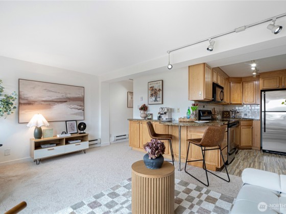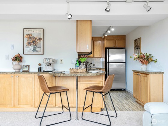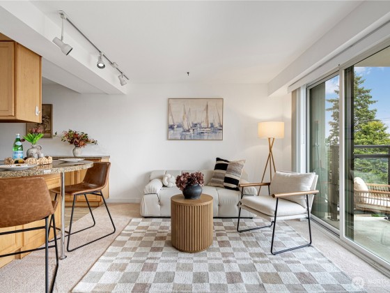 This sunlit 5th-floor, corner condo delivers 1 bedroom plus a office, showcasing modern updates like new carpet, fresh interior paint, and updated flooring throughout, along with a chef-worthy kitchen featuring granite counters, stainless appliances, and custom cabinetry. The light-filled, detached office adds flexibility for work-from-home or storage needs. Enjoy sweeping views of Lake Union and the city skyline from your private covered deck. The pet-friendly building includes dedicated parking, storage, no rental cap, no special assessments, and low HOA fees. Minutes from SLU, Seattle Center, Meta, Amazon and Google campuses. This move-in-ready gem offers style, convenience, and enduring value. Don’t miss this rare opportunity.