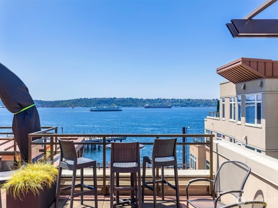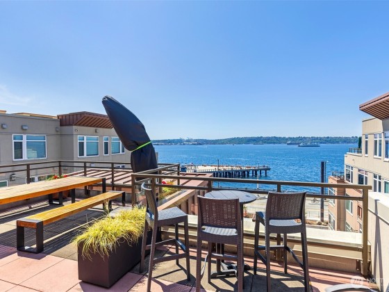 Live in the heart of Seattle's revitalized waterfront with views of Elliott Bay and glowing sunsets right from your unit. Walk score 94/100. Open plan features window shutters, high ceilings, new carpet and gas fireplace. Kitchen and both bathrooms with granite and contemporary fixtures. Master bdrm features 5 piece bath et generous walk-in. 2nd bdrm also function as office with built-in Cabinets/desk/murphy bed, 2 secure parking stalls, private storage, bike locker and no rental cap. LID assessment paid! 24-fir concierge, fitness center, spa, rooftop deck w/BBQ, club room, hobby & conference rooms & guest Suites. Airbnb potential.