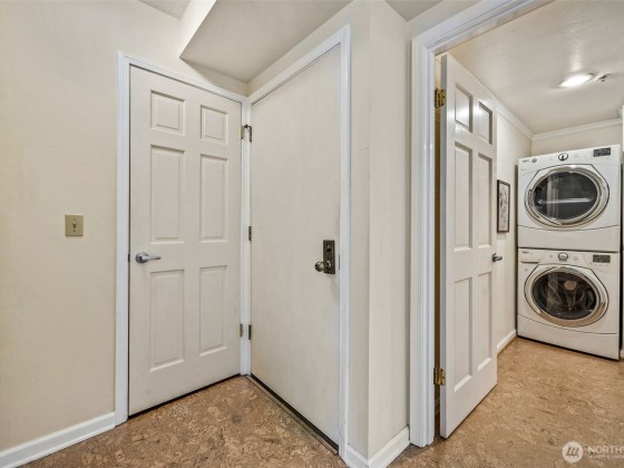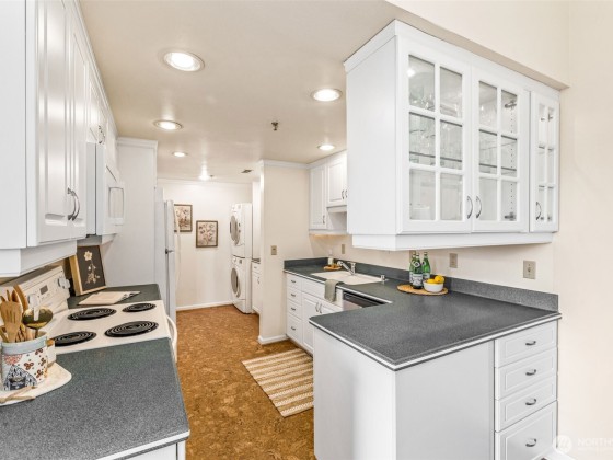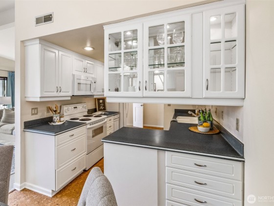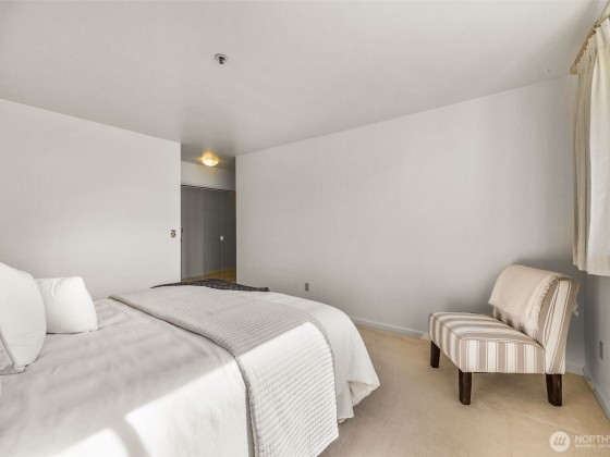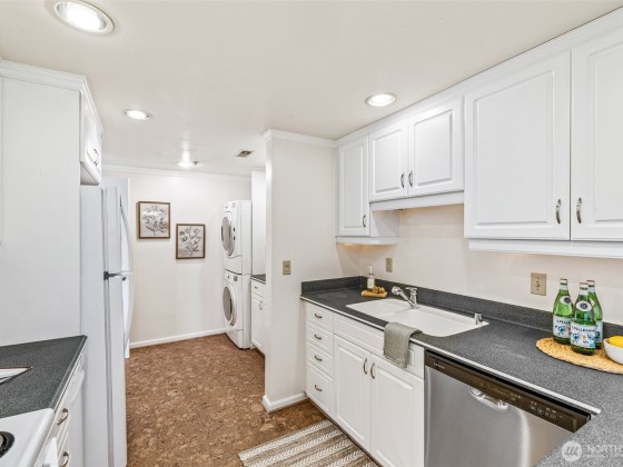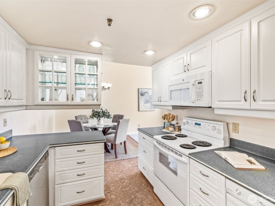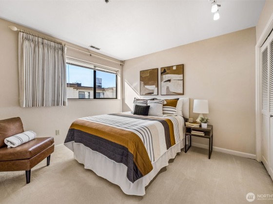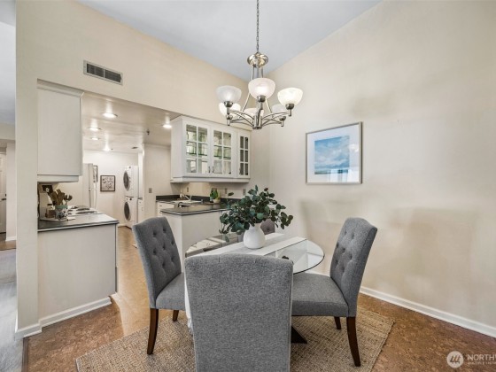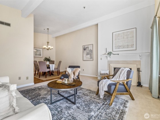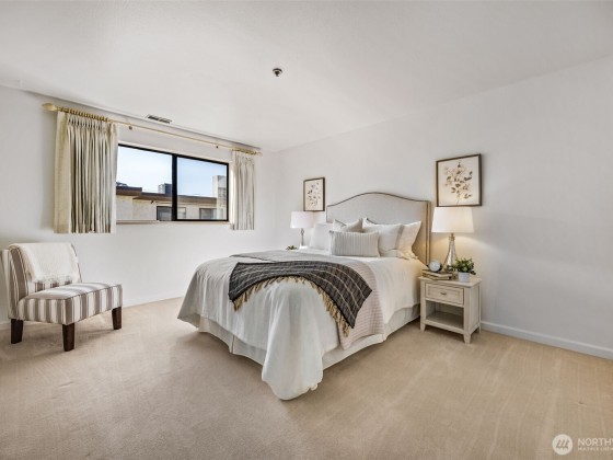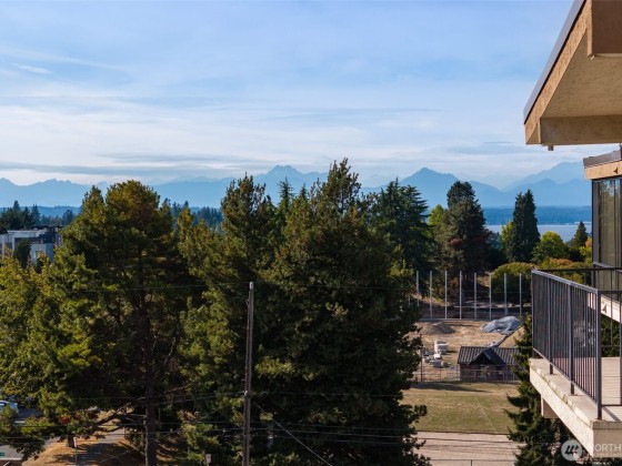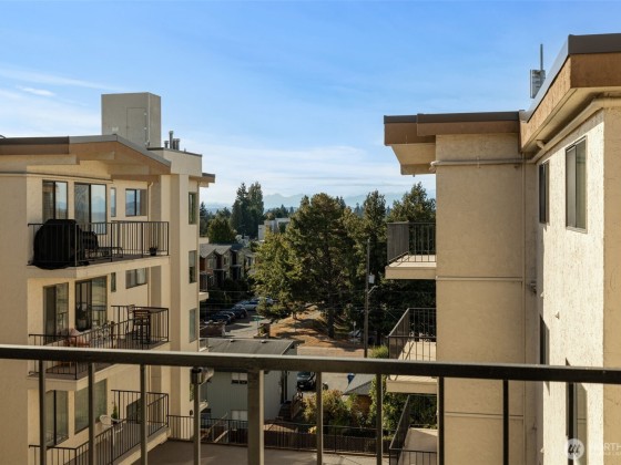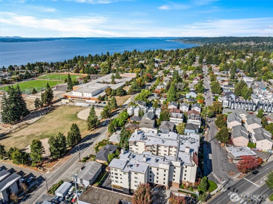 Rare opportunity in Sound View West! Top-floor 2 bed, 1.75 bath Crown Hill condo with abundant natural light, vaulted ceilings, ample storage and a private balcony capturing gorgeous sunset views. The open layout flows easily from the living/dining area into the kitchen with custom cabinetry, breakfast bar and new dishwasher—perfect for entertaining. The primary suite offers two large closets and a three-quarter bath, while the second bedroom is ideal for guests or office. In-unit laundry area, A/C heat pump, storage unit, and gated garage parking add convenience. Enjoy community amenities including a game and recreation room + fitness center w sauna. All just blocks from Met Market, cafés, shops, transit, Ballard, Green Lake, and downtown.
