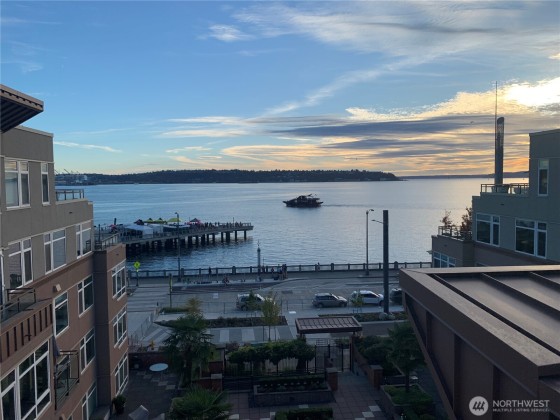 Terrific opportunity to own a waterfront condo near all the action. Enjoy concerts on the pier, wander south to the Aquarium or shop at Pike Place Market. Westerly views of Elliott Bay and charming courtyard from unit. Quaint deck with French doors provides a lovely spot for your morning coffee. Open floor plan with combo living/dining area. Kitchen had gas stove, breakfast bar and wood cabinets. Spacious primary bedroom has walk-in closet. Big den with half bath is currently used as second bedroom. 865ft condo is very quiet and secure. Amazing building amenities include rooftop deck, club room, spa and gym, conference room and concierge. Garage pkg and storage. Pets are welcome as are short term rentals. Unit has established Airbnb income.