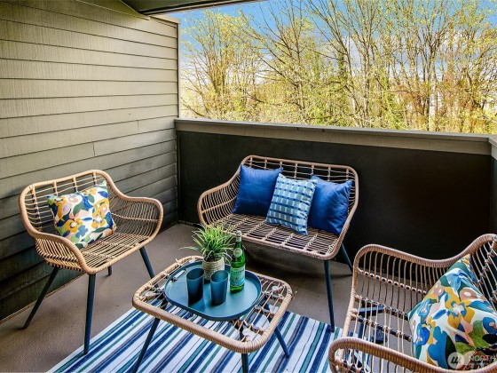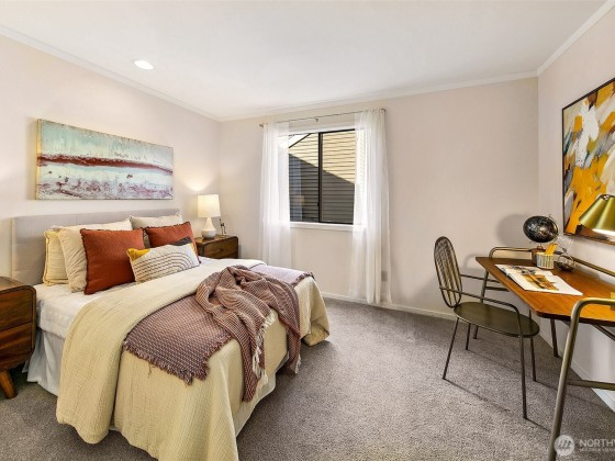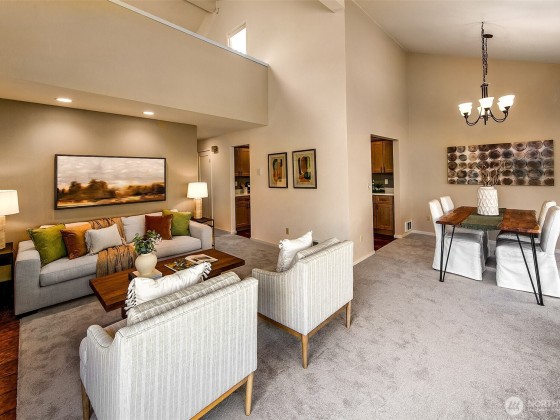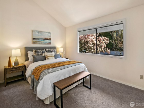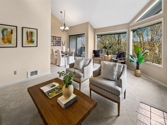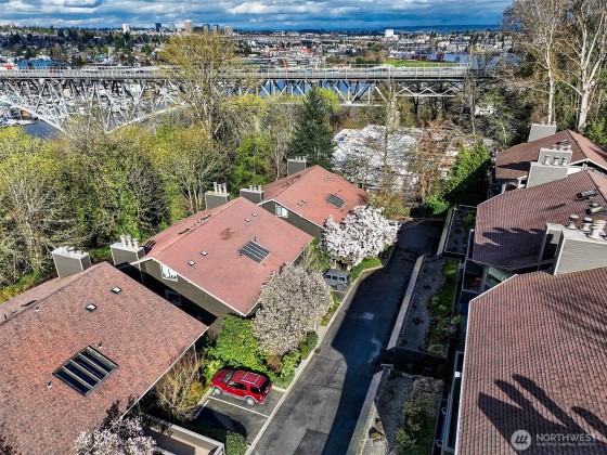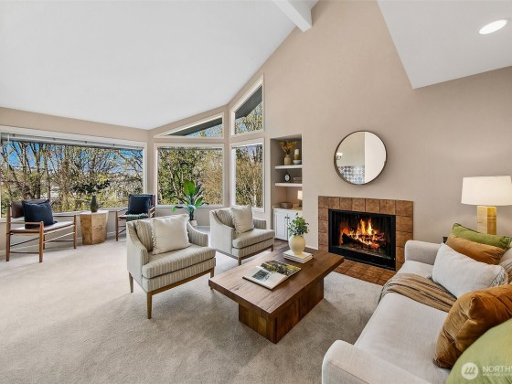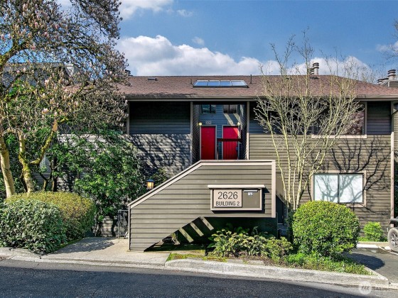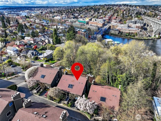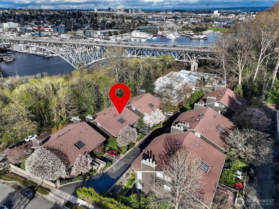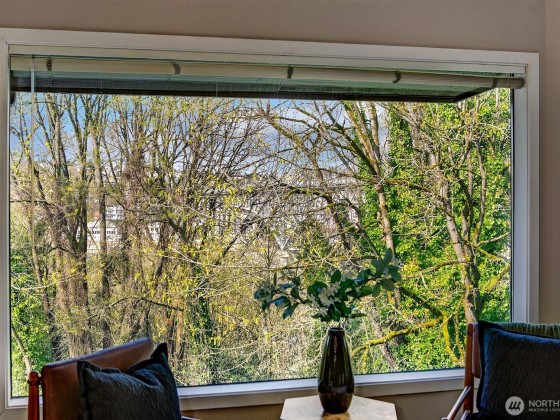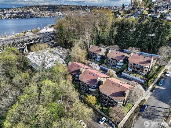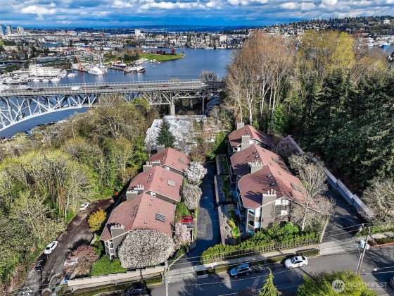 Enjoy ultimate privacy looking out big windows to trees, Fremont, and Lake Union. Top floor 2 level condo is not your basic condo with vaulted ceilings and huge windows. Brand new kitchen (in 2025!) with hardwoods, formal dining space, a private deck, and large living room featuring a fireplace and walls of windows. 3 bedrooms; two on the main floor with a full bath and a high ceiling loft style primary bedroom with ensuite bath and huge walk-in closet upstairs. New carpet and fresh paint throughout. Plenty of storage, including a large room for en suite laundry and extra closet space. Garage parking included and additional guest parking available. HOA includes utilities plus high speed internet, Insurance, Grounds and Exterior maintenance.