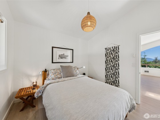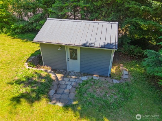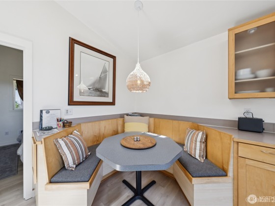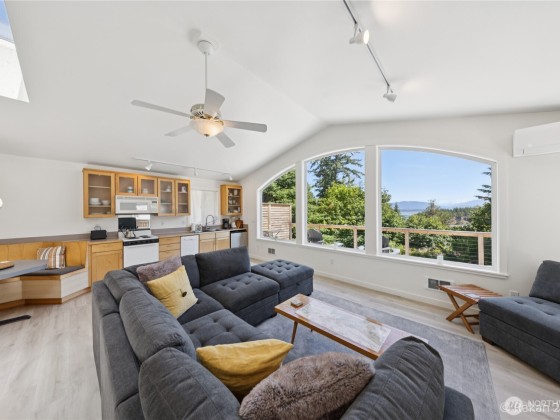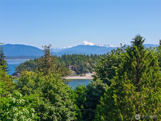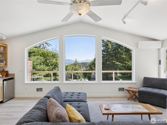 Turn-key, Guemes Island contemporary cabin with a wall of windows to let the natural light in. Stunning views of Mt Baker, Huckleberry Island and the bay from inside and on the deck. Open concept with a built-in dining nook, living area and kitchen with a wall of cabinets. One bedroom and one full bathroom. LVP Flooring by Gaia throughout. Ductless mini split heats the main area with wall heaters in the smaller rooms. The 720 SF garage is fully finished with counters, a sink, a second fridge, washer and dryer and half bath. Separate 192 SF Studio. This community has three coves to enjoy. Cooks Cove has a boat ramp. This home is now used as a profitable Airbnb. There are outdoor stairs to the main living area and deck.