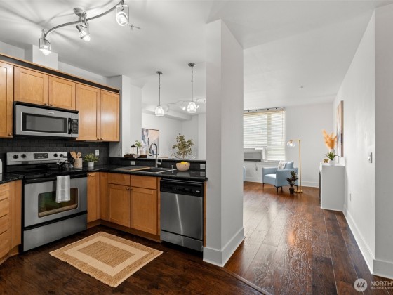 Urban ease meets modern comfort at Reverie at Marcato! This well-appointed 1-bedroom condo blends downtown convenience with contemporary style—perfect for those who value walkability, community, and low-maintenance living. 745 SF of efficiently designed space with open layout, radiant heat, granite counters, stainless appliances, and breakfast bar. In-unit laundry, garage parking, and storage add convenience. Explore cafés, breweries, McMenamins, Theater District, UW Tacoma, and the waterfront—just blocks away, commuter-friendly with access to I-5, Sounder, and light rail. Building amenities include a private movie theater, fitness center, lounge, BBQ courtyard, and secure entry. Tacoma living without compromise!