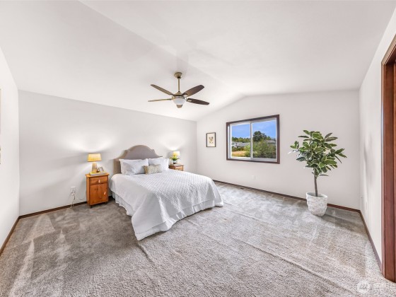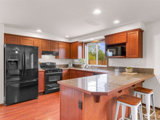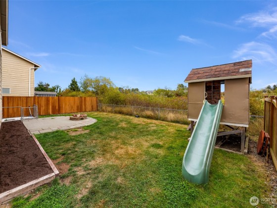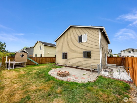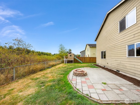 Beaches, Boats & Birch Bay Sunsets nearby! Bay Crest South home has Cherry finish trim & cabinets thru-out. The dining area slider opens to the side yard & leads to a patio/firepit & playhouse. Granite tile counters are in the kitchen, a new microwave with all appliances incl. The living room is off the kitchen/dining & has a large window overlooking your backyard, no neighbors at the chain link fence, just nature. Upstairs, you'll find an office/media area with a built-in desk, laundry room plus a full bathroom. Walk-in closets are in all 3 bedrooms. The primary bedroom overlooks the backyard w/a walk-in closet that is HUGE. Double sinks in the primary ensuite. Backs to a greenbelt w/a side gate. 1/2 bath on main. Bring this home to life.