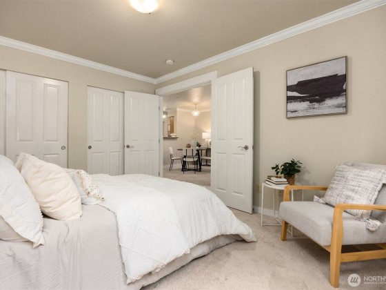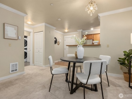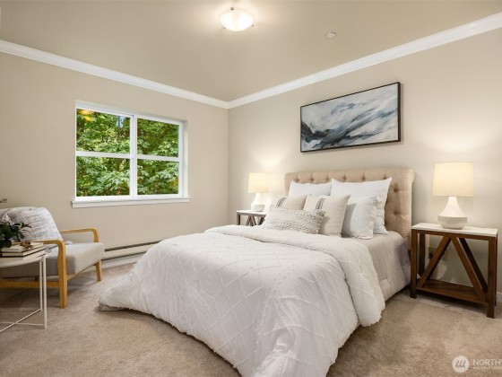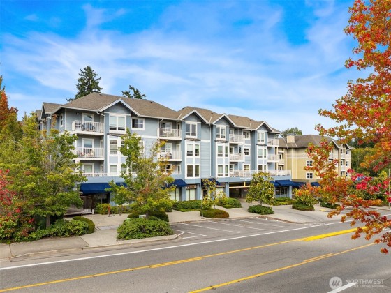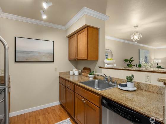 Welcome to Island Crossings, a condominium close to shopping, public transit, and island amenities such as an aquatic center and library. This one-bedroom home has been lightly lived in and well maintained. Granite countertops and stainless steel appliances adorn the kitchen and crown molding adds a touch of elegance. The living room is anchored by an electric fireplace with deep mantel. Enjoy a dedicated, covered parking space in a secure garage, and building access from lobby with code or key only. An elevator will whisk you to the third floor, where this home is located on the quiet north side of the building. Windows overlook 2+ acres of forested open space that abuts the 22-acre Sakai Park.