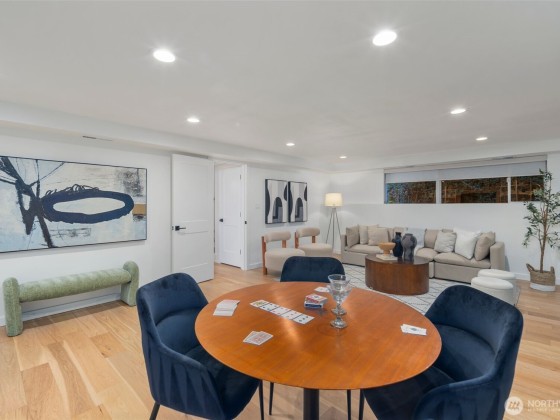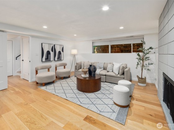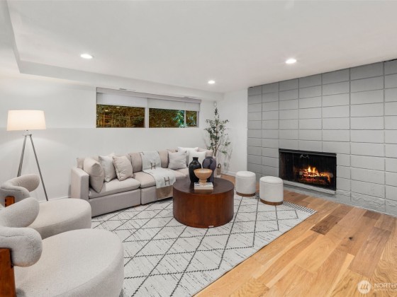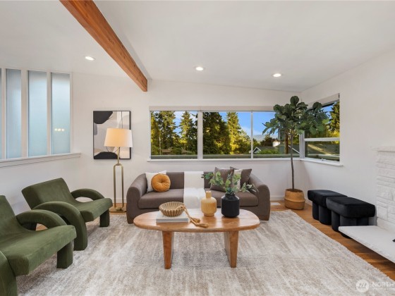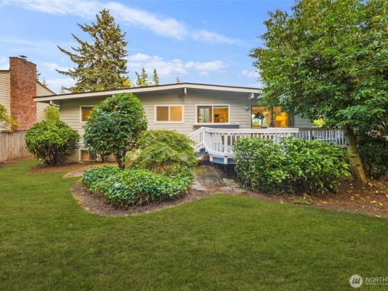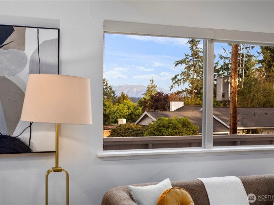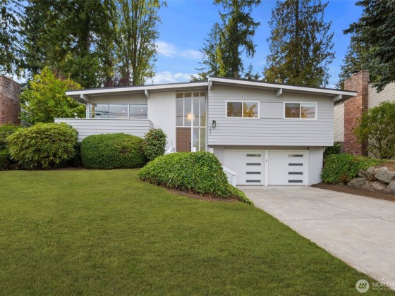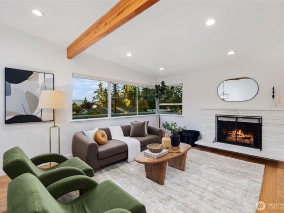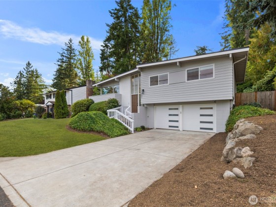 Stunning mid-century remodel in sought-after Lochmoor with sweeping Cascade views and an open, light-filled design. The heart of the home is a modern kitchen with quartz counters, stainless appliances, and an induction cooktop, seamlessly blending style and function. Recent upgrades include newer windows, A/C, furnace, PVC roof, garage doors, waterproof engineered hardwoods, plus refreshed baths, electrical, water heater, doors, and hardware. The lower level offers a spacious bonus room with a cozy fireplace. Outside, enjoy a private fenced backyard and deck. All within the top-rated Bellevue School District and close to Crossroads, parks, shops, dining, and major freeways.