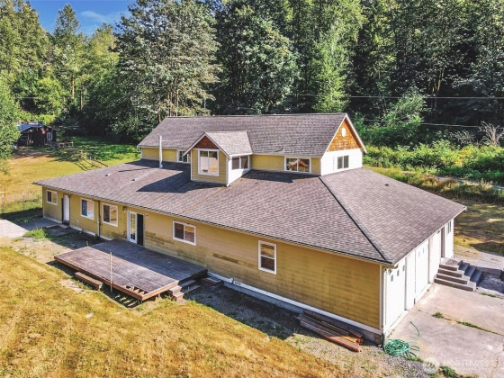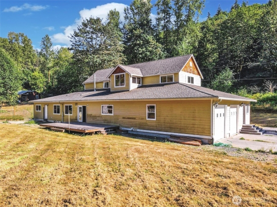This spacious 5,140 sq ft home sits on 5 private acres and offers a rare opportunity to bring your vision to life. 4 bedrooms, 3.5 baths, and a layout full of possibility, this home is unfinished and ready for your custom touches. Bonus room. private office, open-concept living room with a see-through gas fireplace, formal dining room, upstairs recreation room, potential ADU (Accessory Dwelling Unit) for added income or guest quarters. The serene setting includes space for animals, a year-round creek, and room to host large gatherings in the peaceful outdoors. Just minutes from downtown Granite Falls. This property is being sold as-is and is perfect for an investor or investment group looking for a unique project in a desirable area.