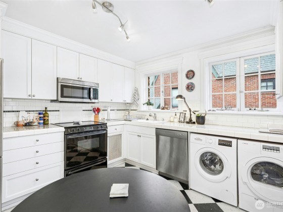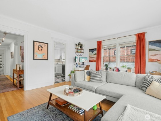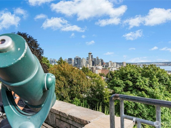The Victoria is a stately classic building on scenic West Highland Drive near Kerry Park in the vibrant Queen Anne neighborhood. You are welcomed into a gorgeous landscaped courtyard before entering the well run and superbly maintained condominium. Enjoy the architectural details of the lobby before your vintage elevator ride. # 404 is a top floor light-filled corner unit. Features include oak hardwood floors, high ceilings, decorative crown molding, kitchen with eating space, newer appliances (in unit laundry), gorgeous bathroom with floor to ceiling subway tile, closet system, and city/Space Needle view from the living room. There is a storage unit and designated garage parking. The Victoria features a laundry room, bike room, and gym.