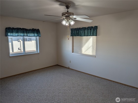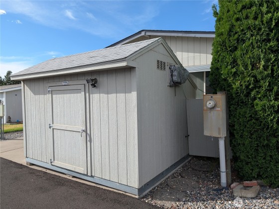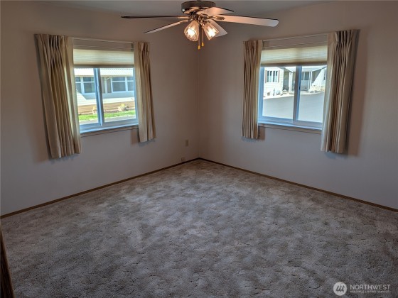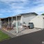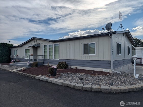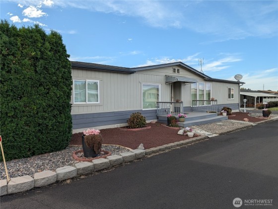 Rare opportunity for well cared for home in highly desirable Golden West Estates. Large 1624 sq. ft open floor plan w/ 2 bdrms on one end w/ full ba. & Primary bdrm & updated primary ba. w/ large tiled walk-in shower, double sinks, tiled floors & skylight at the other end. Updated High efficiency HVAC & water heater for many years of dependable use. Newer stainless steel refrigerator & dishwasher w/ skylight in kitchen that has eating bar off dining area w/ ranch style door w/ opening sidelight panels leading out to cover patio deck. Deck also has large BBQ area w/ an exit door off the utility room. Rock landscaping w/ drip irrigation to plants & pots, no grass to mow! Wired & insulated storage shed too. Located across from pool & Rec Hall.