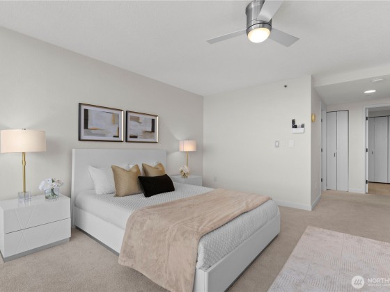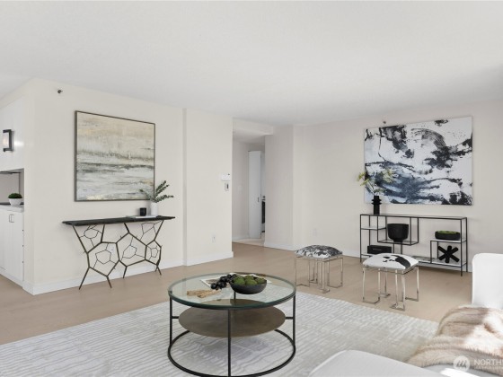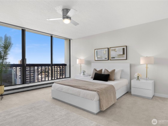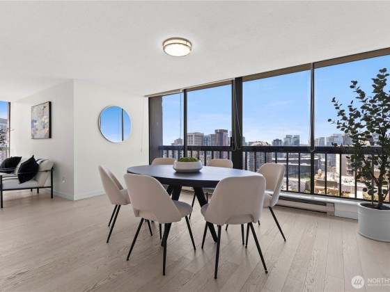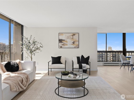 Soak in the views of Seattle in this beautiful 17th floor condo! Enjoy the sights of the city and the Sound from any corner of the light-filled unit. This rare, upper-level corner unit offers 3 spacious bedrooms and an expansive open space. Amenities include a new indoor pool, hot tub, sauna, fitness center, and more. Recent updates include new hardwood flooring, carpet, and appliances. Secured indoor parking garage includes a private storage room and 2 parking spots. Central and convenient location with a walk score of 97! Commute to downtown in minutes. HOA covers all utilities.