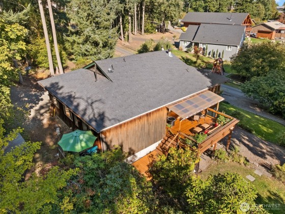 Frank Lloyd Wright inspired home with fantastic views of Mount Rainier, Puget Sound, & Chambers Bay Golf Course. Entry opens up to a gorgeous kitchen/dining area w/cedar wood throughout, stainless steel appliances & plenty of storage. Large living area that steps out to your private porch w/stunning views. The main level of the home features a primary bedroom w/en suite, 3 additional bedrooms, full guest bath, & laundry. Unfinished basement w/tons of potential to add additional living area. Basement is plumbed for a bathroom, has a 2nd laundry area & its own exterior entrance. Attached 1 car garage & space on the lot for outbuildings. Beautifully landscaped w/fruit trees. This home is ideal for a year round private oasis.