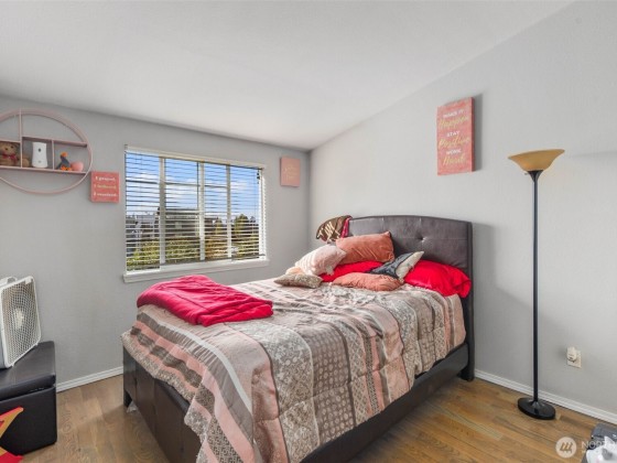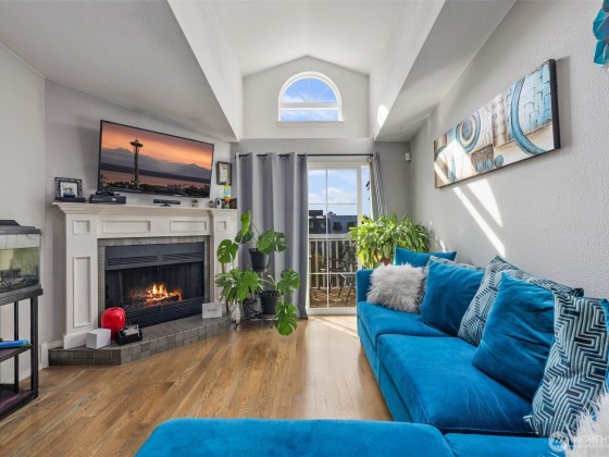 Bright Top-Floor Unit with Vaulted Ceilings & View! Move-in ready 1 bed / 1 bath condo featuring stainless steel appliances, tile countertops, dual sinks, and a cozy fireplace. Enjoy a large walk-in closet, private deck with extra storage, and assigned parking plus carport. Perfect for commuters—just minutes to I-5, Hwy 99, and close to transit! future light rail opening end of 2025. Great for buyers, downsizers, or investors!
