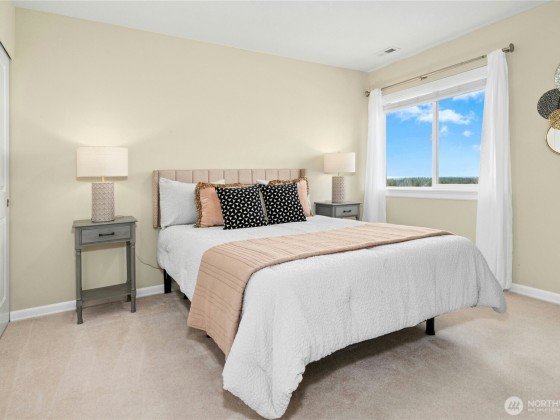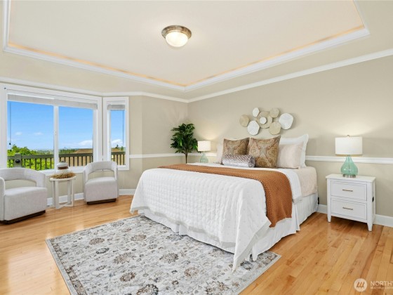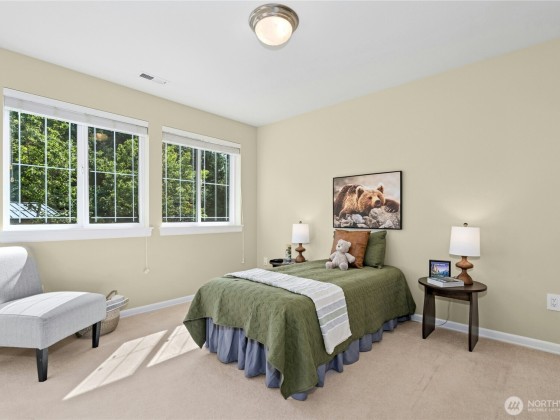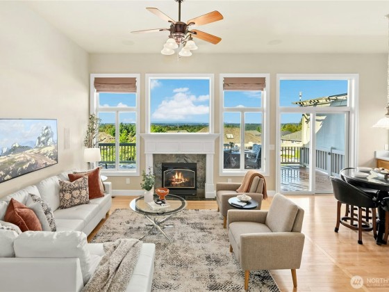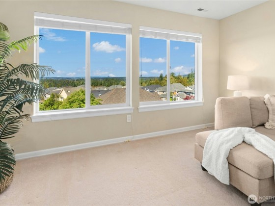 Privately nestled at the top of Woodside at McGarvey Park backing 400ac of forest framing 5 miles of trails. Vaulted, welcoming interiors & unmatched livability: MAIN FLOOR OWNER SUITE AND 2nd bedroom by ¾ bathroom & upstairs bonus room for games. Fun, social neighborhood w/summer & holiday events, 6 fantastic community parks just steps away, disc golf coming. Gorgeous kitchen w/warm cider cabinets, statement 50k BTU Italian range, new quartz, pantry. Great room opens to 600sf deck w/hot tub has unobstructed VIEWS of Seattle skyline, Olympics, sunsets & fireworks! Rich hues of stacked stone, hardwoods, travertine, quartzite, tall ceilings, classic millwork. 3-car garage, Tesla EVC, A/C, healthy furnace UV filtration. New roof/furnace/paint