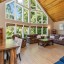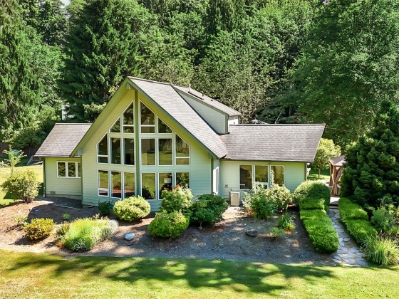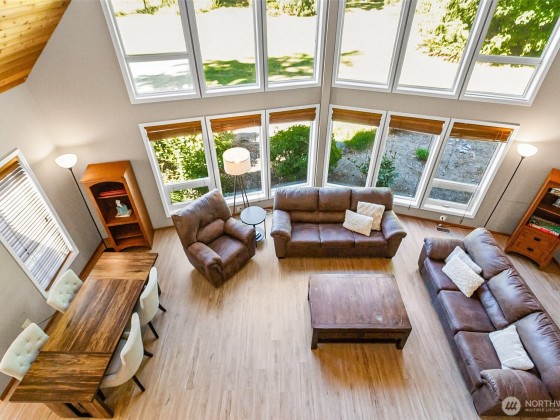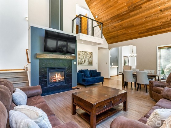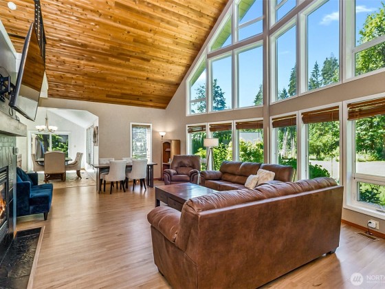 This exceptional property provides privacy, seclusion, beautiful waterfront & a gorgeous home. The tiled entry welcomes you to open spaces w/vaulted ceilings, full wall of windows & gas fireplace in the fantastic living room. Holiday sized dining room opens to covered patio w/hot tub. The kitchen is bright, open & includes quality appliances & cabinetry, gas range, breakfast bar. Two bedrooms on the main level include the primary w/ luxurious bath, walk-in closet. A second primary suite on the upper level has a full bath, walk-in closet & view balcony. Welcome natural light throughout & the view is inspiring. Level, sunny 2.3 acre lot with mature landscaping, firepit, horseshoes, generous parking. Fully furnished, turnkey vacation rental.