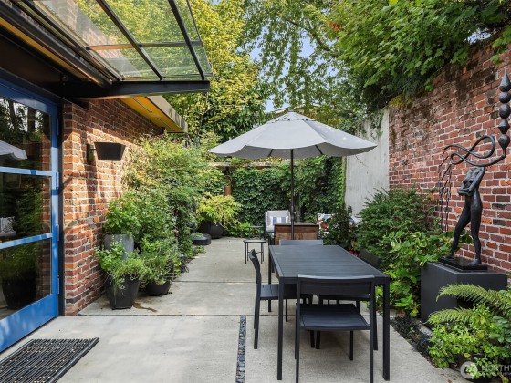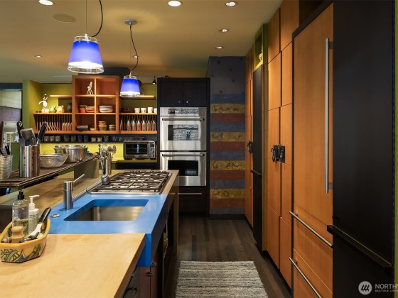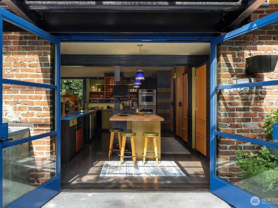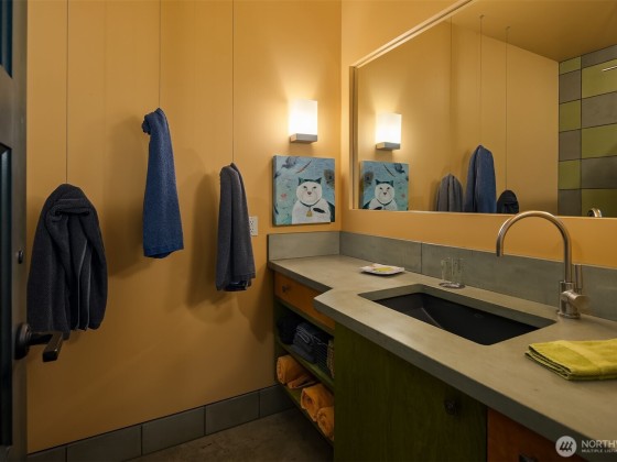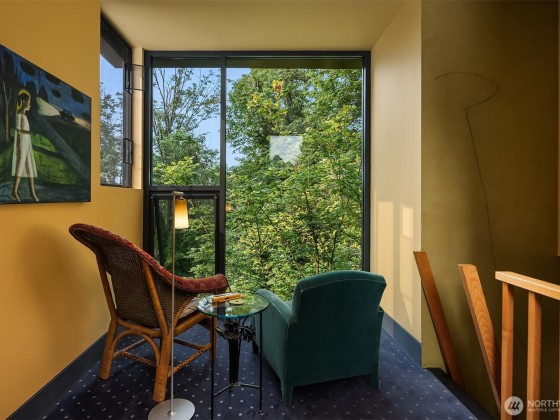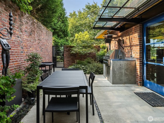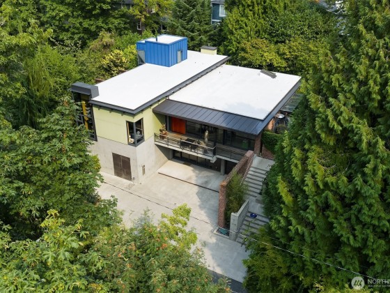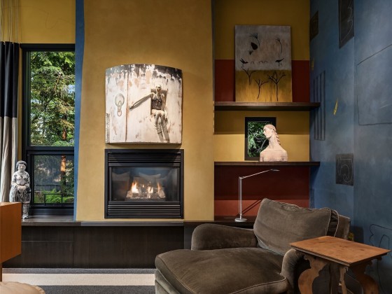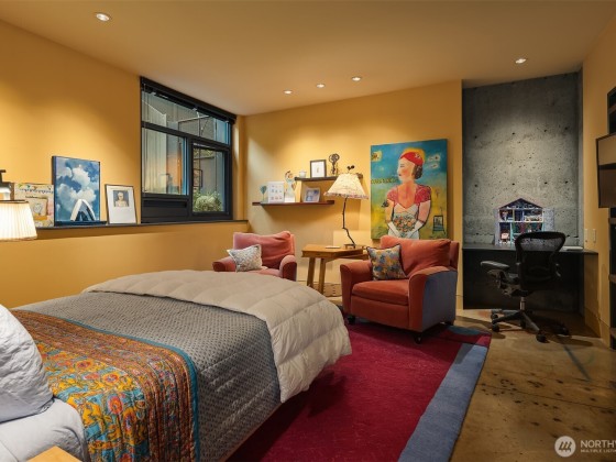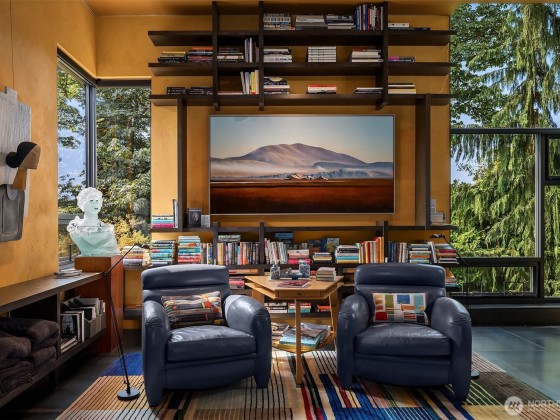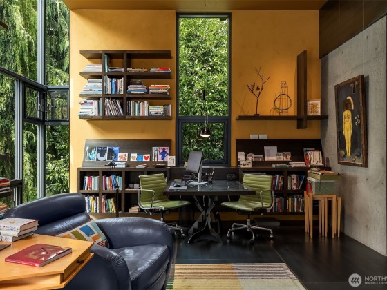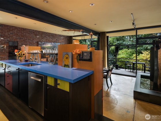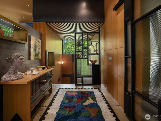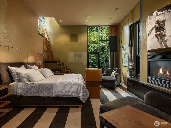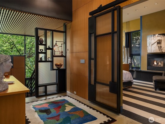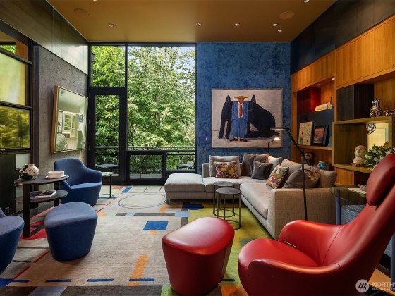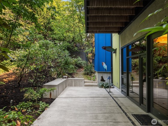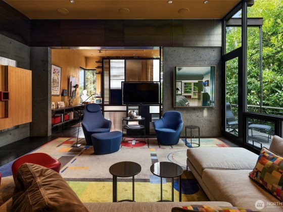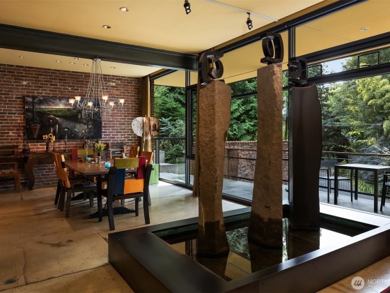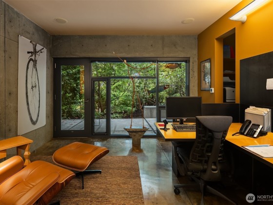First time on market! Art and architecture coexist seamlessly in this exceptional custom designed contemporary home. A wall of glass and Julie Speidel water sculpture sets the tone upon entering. Hand-painted concrete floors, 14 ft ceiling with cold rolled steel accents, designer lighting, a fusion of texture & color throughout. Every surface is artisan crafted. Kitchen features rift-sawn cabinetry, high-end appliances, & opens to a private patio dappled in sunlight. Main floor primary bedroom includes a meditation alcove, fireplace, automated shades, a chic en-suite bathroom & large walk-in closet. Additional rooms provide opportunities for guests, home fitness, office, media room, or expanding your art collection. Lush & secluded setting!