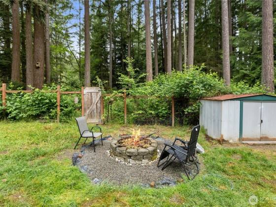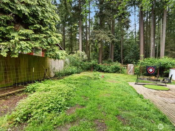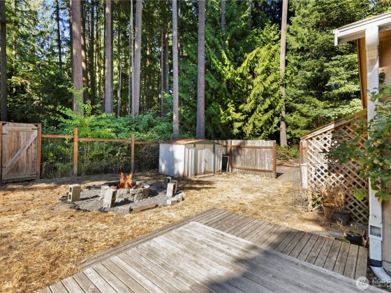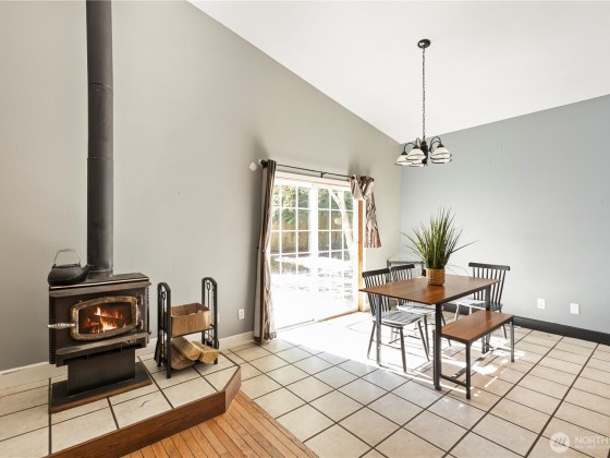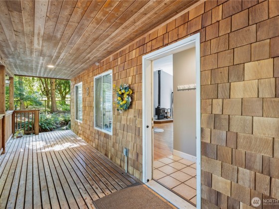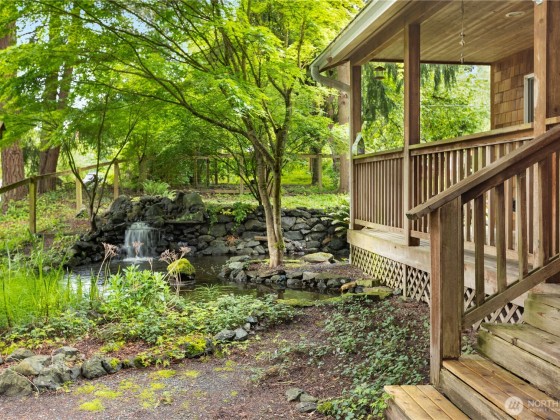 Tucked into a peaceful, wooded setting, this Clinton home offers the perfect blend of comfort and nature. A classic cabin-style front porch welcomes you in, leading to vaulted ceilings, hardwood and tile floors, and a cozy wood stove for chilly evenings. The open kitchen is ideal for everyday living or weekend entertaining. Step outside to your own private oasis with a koi pond and waterfall. The primary suite includes an attached bath. Ample storage throughout. Private access to Deer Lake adds year-round recreation to this serene Whidbey Island getaway.