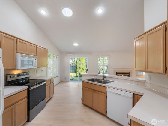 First time on the market! Wonderful 3 BR, 2 bath in the very desirable Sunrise development. Pride in ownership shows in this home. The large first floor kitchen (all appliances stay, including W/D) with eating bar and table area opens to the light and bright living room with gas fireplace. The large primary BR with en-suite 3/4 bath, walk in closet and the laundry room are also on the main level. Upstairs are 2 large bed rooms, full bath and plenty of storage. Out back you find a secluded, private patio in the fully fenced yard for relaxing/entertaining with well established landscaping. Architectural comp roof installed in 2018. The Puyallup Sunrise Community offers walking paths, park/green areas, athletic court and a clubhouse.