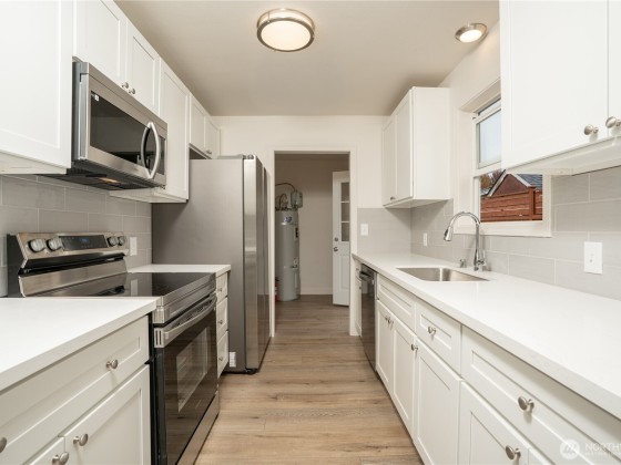 Stunning, fully remodeled 3 bedroom home on an over-sized lot with room to grow! Experience move-in perfection with a desirable primary bedroom on the main floor and two spacious upstairs bedrooms. The updated kitchen shines with crisp white shaker cabinets, elegant quartz counters, a stylish tile backsplash, and all-new stainless steel appliances. Excellent natural light highlights the generously sized living and dining rooms, complete with charming coved ceilings. The home boasts a remodeled bathroom and a large utility room with extra storage space. Enjoy peace of mind and low maintenance with vinyl windows, low-maintenance siding, 100% new flooring, fresh paint, and updated fixtures throughout. Turn-key!