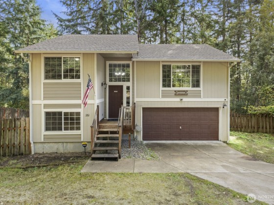 Lovely 3-bedroom home in Beards Cove! This charming split-level with a fully fenced yard offers privacy and plenty of space for gardening, plus 2-car garage with extra storage. Upper level features spacious living area, dining room, large kitchen with breakfast bar, and beautiful bamboo flooring. Plus the primary bedroom, guest bedroom and full bathroom. Lower level has a spacious family room, guest bedroom, 3/4 bath, and utility room. Beards cove Community includes a private beach, boat launch, a refreshing outdoor pool perfect for sunny days, a playground, basketball court, walking trail, picnic area & open field looking out to Hood Canal. Don't miss your chance to call this house your home!