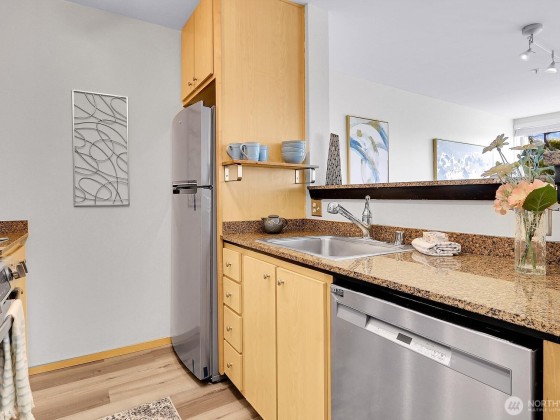 A refined one-bedroom plus den condo with oversized windows framing dramatic sunsets, city lights, and mountain views. The open floorplan flows into a modern kitchen with granite counters and brand-new stainless-steel appliances. Find a breakfast bar perfect for entertaining. Retreat to the spacious bedroom with its generous walk-in closet. The versatile den offers the ideal space for WFH or to accommodate overnight guests. Built in 2005, this well-kept, pet-friendly building offers a fully equipped fitness center, patio, secure parking, and responsive management. Ideally located near parks, dining, shopping and just minutes to downtown, I-5, and I-90.