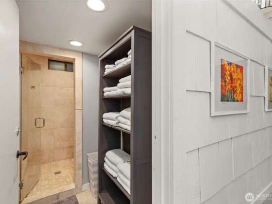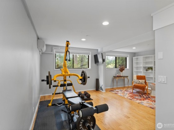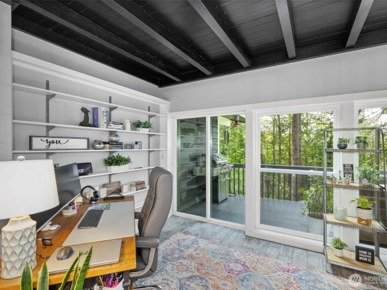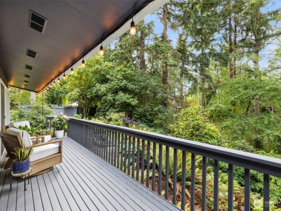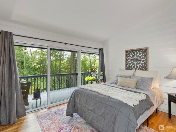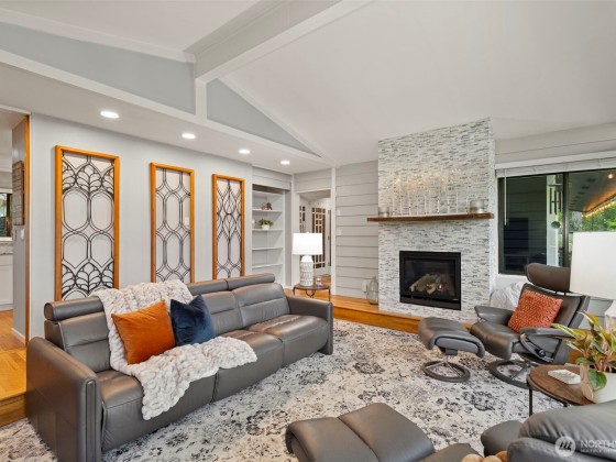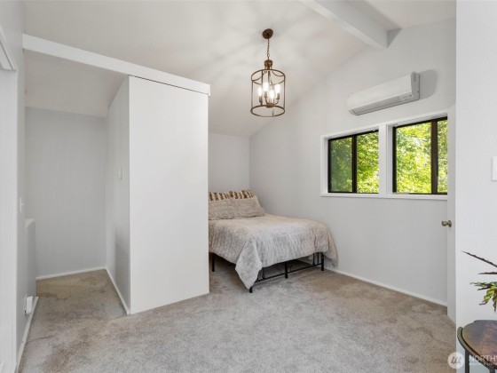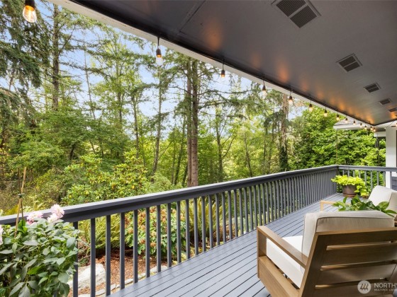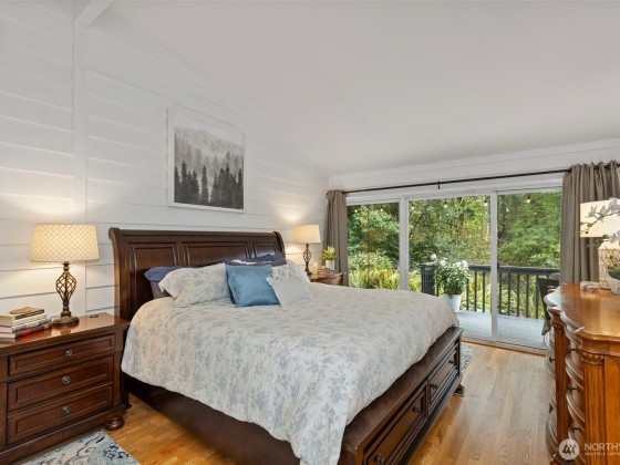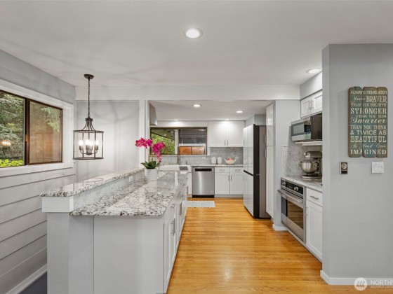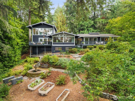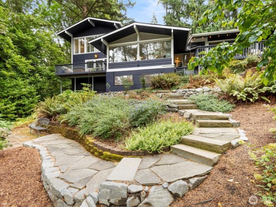 Tucked at the end of a quaint, treed lane, this 3,101 sq ft mid-century home rests on a thoughtfully landscaped .55-acre lot. Wall-to-wall windows fill the interior with natural light. The updated kitchen features granite counters, Viking appliances, a 6-burner gas stove, & an oversized farmhouse sink, flowing to a spacious dining room with built-ins & HUGE pantry. The main-floor primary suite offers vaulted ceilings, garden-view deck access, ensuite bath, and generous closets. Also on the main: a 2nd bedroom & office. Upstairs, a bedroom with attached office/flex space adds versatility. The lower level includes a huge bonus room, 3/4 bath, & laundry. Fresh exterior paint, 2-car garage, & stone paths complete this Bainbridge retreat.