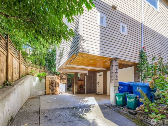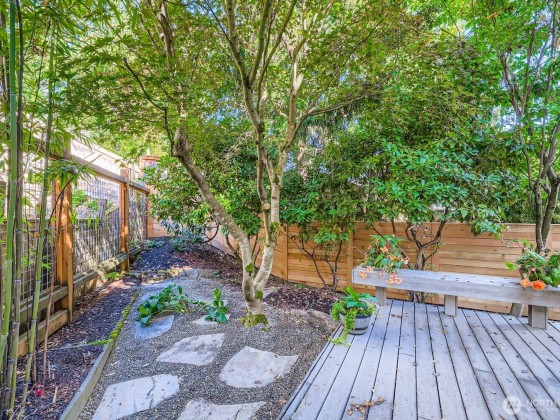 Beautifully updated independent end-unit townhome tucked just four homes off Madison. Private and quiet with a wrap-around deck and garden designed by Cliff Willworth. Inside, the kitchen shines with granite counters, slate floors, Viking range, stainless appliances, a brand-new refrigerator, and kitchen sink. A custom bar with wine fridge and copper-paneled powder room add modern character. The expansive primary suite features vaulted ceilings, sitting area, private deck, and jetted tub. Move-in ready with fresh paint inside, new carpet, and a new roof with transferable warranty. Parking includes a garage plus an additional off-street space. Convenient to schools, restaurants, the Arboretum, lake access —this great house is ready for you.