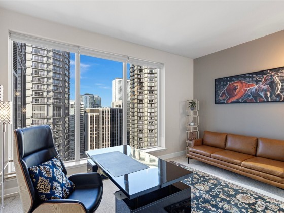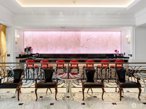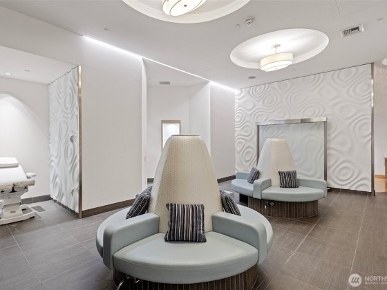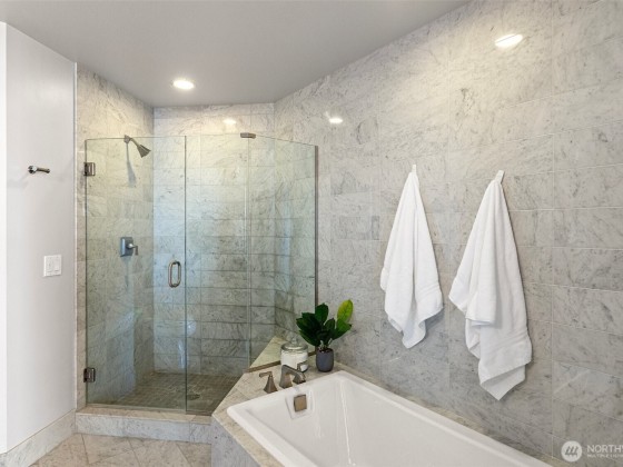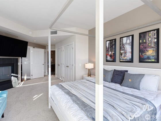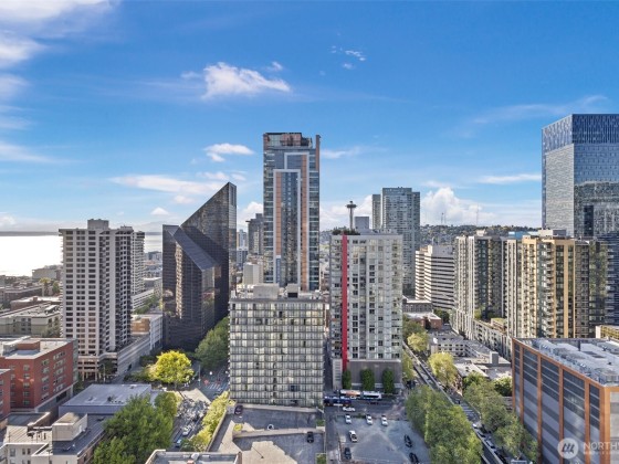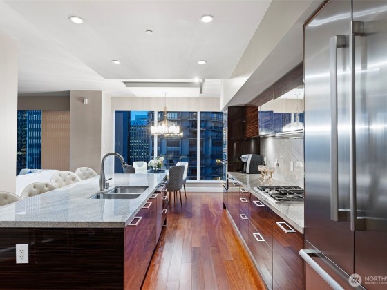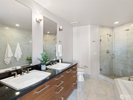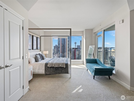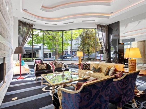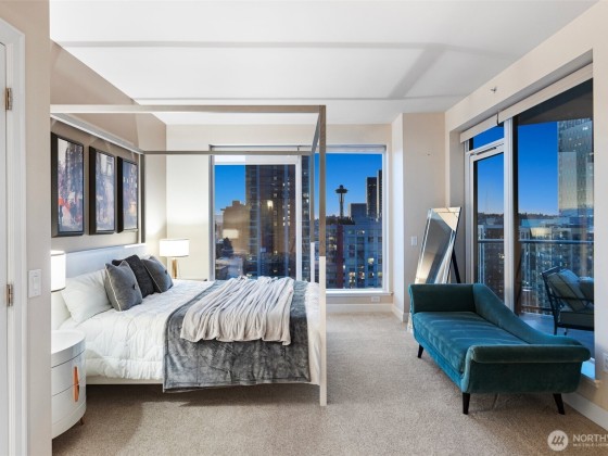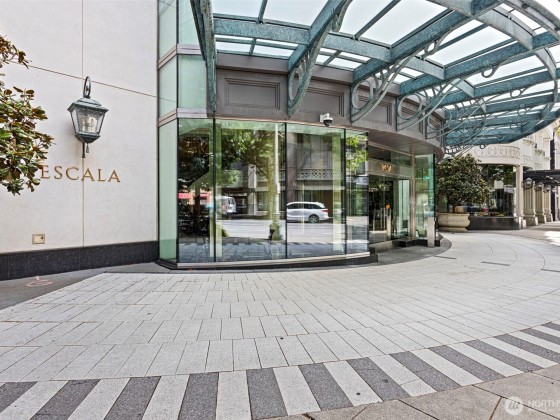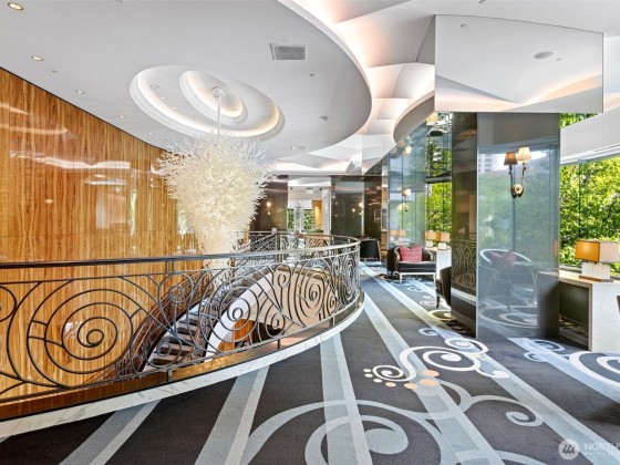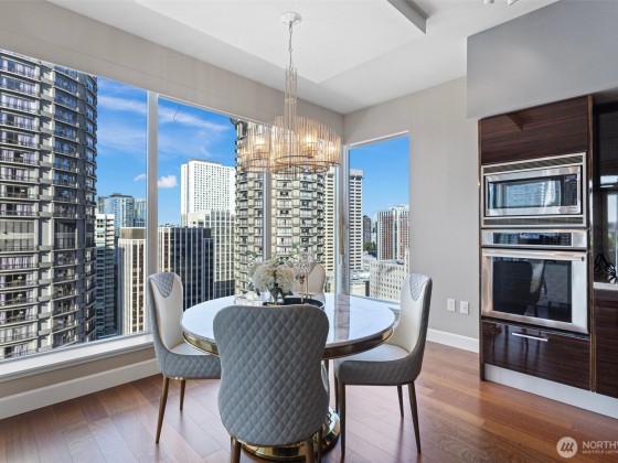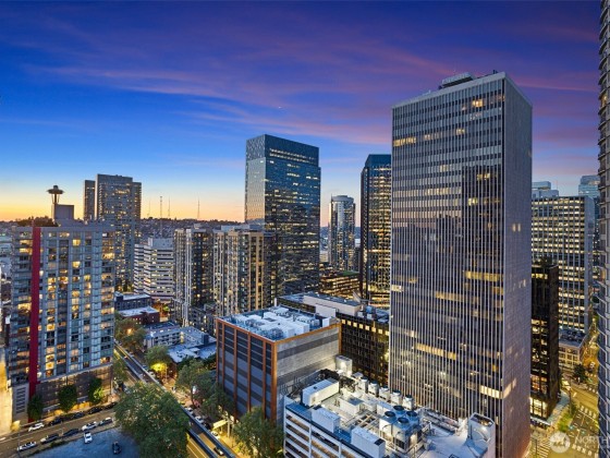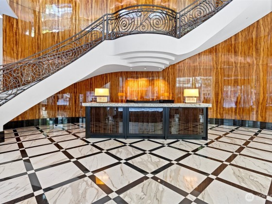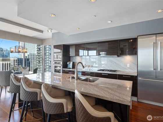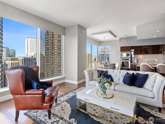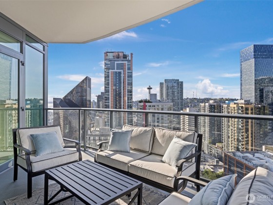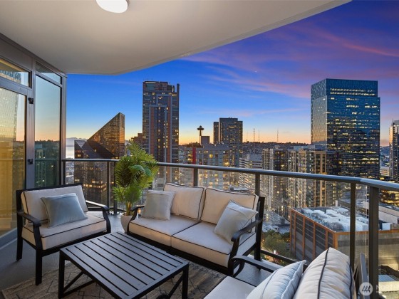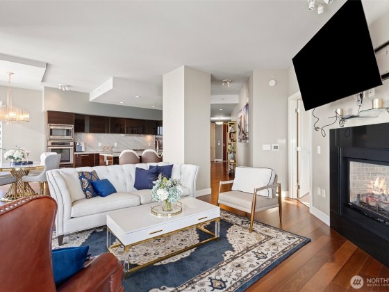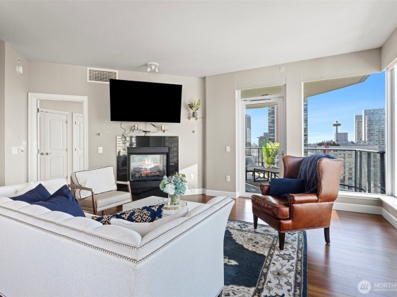 Stunning northeast corner condo with panoramic views of Elliott Bay, the Olympic Mountains, the Space Needle, and Lake Union. This coveted layout features a grand entryway, custom mudroom with utility sink, and a gourmet kitchen with Pedini cabinets, slab countertops, and stainless steel appliances. The open living area, with a gas fireplace and expansive windows, connects to a covered terrace ideal for year-round enjoyment. The primary suite has three closets and a luxurious five-piece bath. A separate guest wing includes a spacious bedroom and a full bath. Building amenities are top-notch and managed by a premier hospitality company. Includes two parking spaces and a storage unit. Fabulous location. Welcome Home!