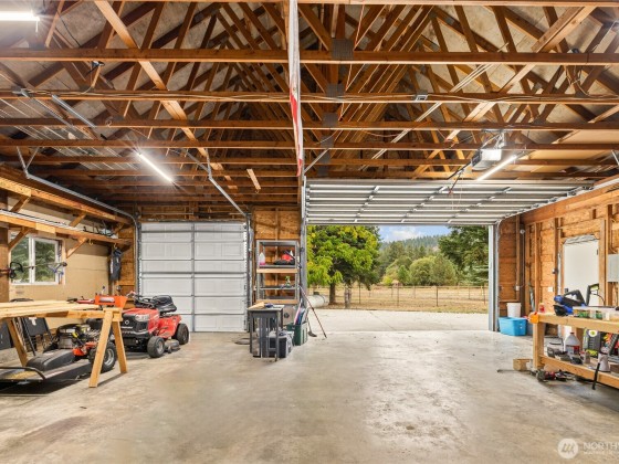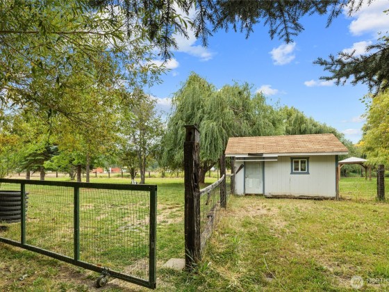 This private, cozy 1,620 sq ft cabin-inspired home offers a tranquil escape on a sprawling 3.38-acre lot. Discover the Great Room with vaulted ceilings & natural wood beams and tongue and groove ceiling, providing a warm, rustic elegance. The home features 3 bedrooms, including 2 comfortable guest rooms. The upper-level primary suite is a true sanctuary, featuring a walk-in closet and an ensuite w/ dual vanity and large tub+shower. The property's privacy is enhanced by a spacious deck for entertaining & large private pond & lush open pasture. Outside, a large shop w/ a dedicated workshop provides utility/storage + multiple sheds/outbuildings & fruit trees. The partially fenced acreage, complete with a dog run, awaits your outdoor lifestyle.