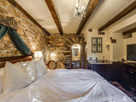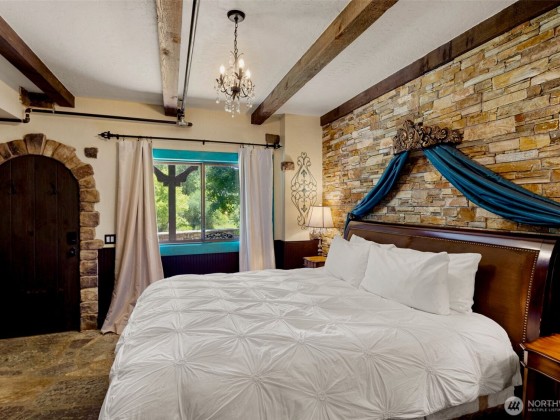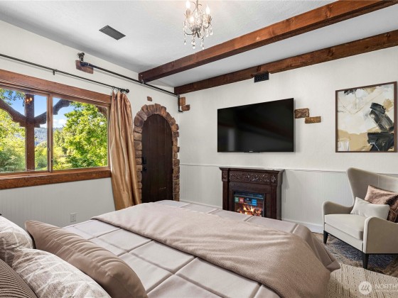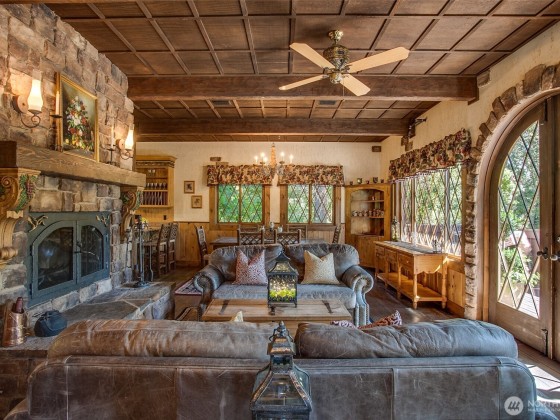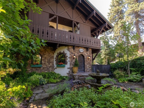 Discount for Cash ~ Rare Opportunity: Waterfront & Commercially Zoned in downtown Leavenworth. Bavarian style manor with views of the Wenatchee River, mountains and Black Bird Island. Currently 3 suites are offered as nightly rentals with the option of adding the 2 additional bedrooms as nightly rentals for increased revenue. Hardwood and stone flooring, soaking tubs, waterfall stone showers, wood burning fireplaces, rustic wood beams, on-site parking and fountain garden. Sale includes all furnishings, including antique items.