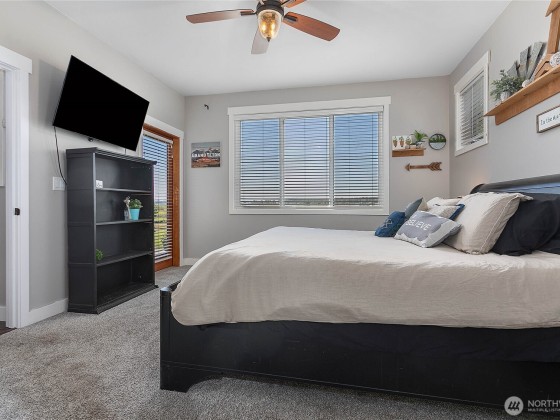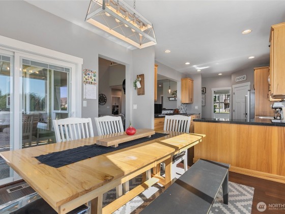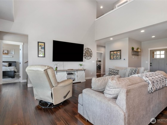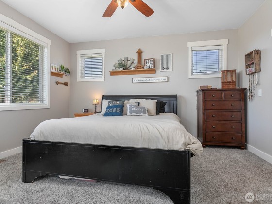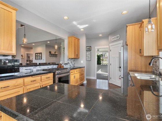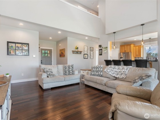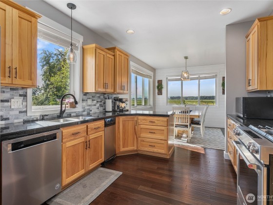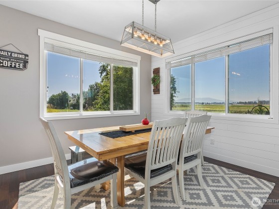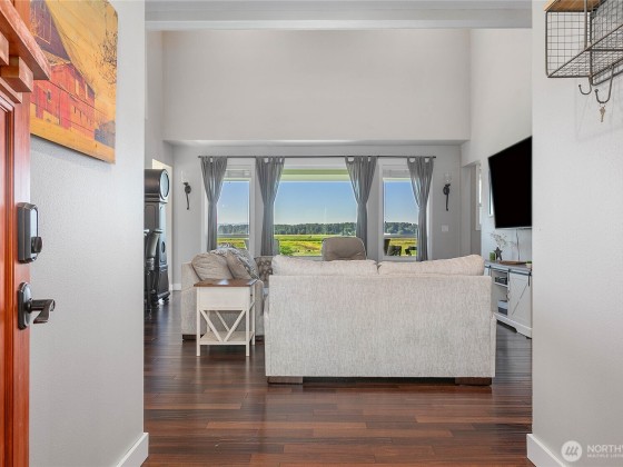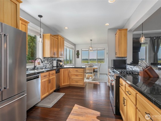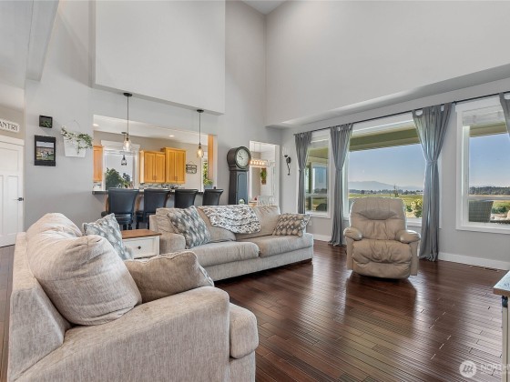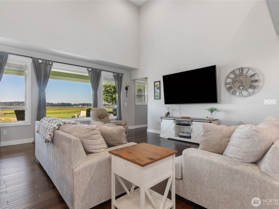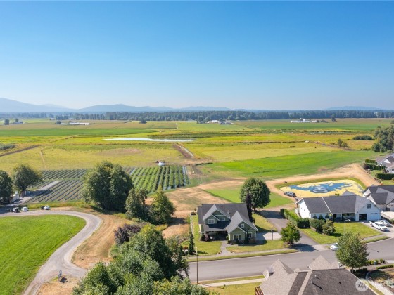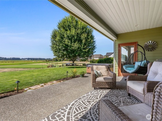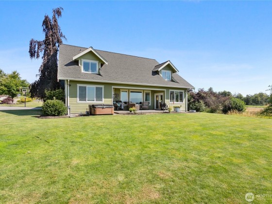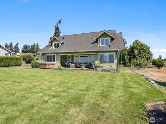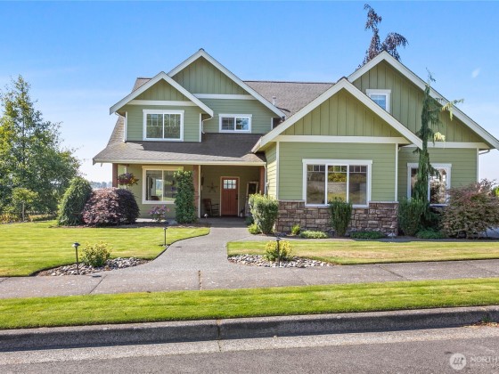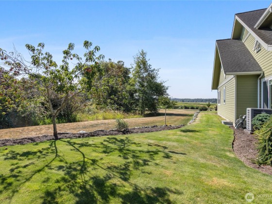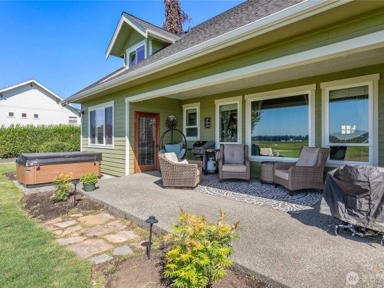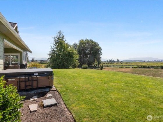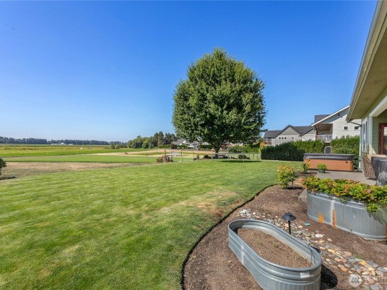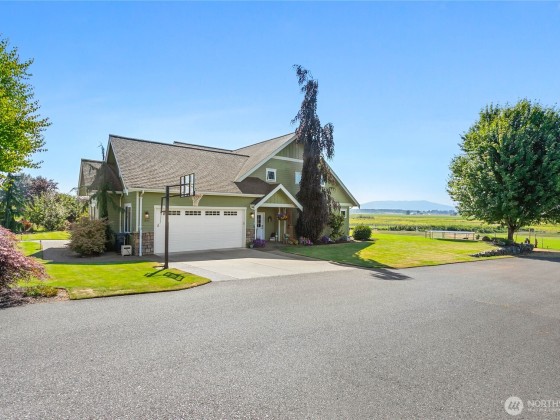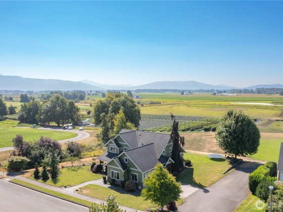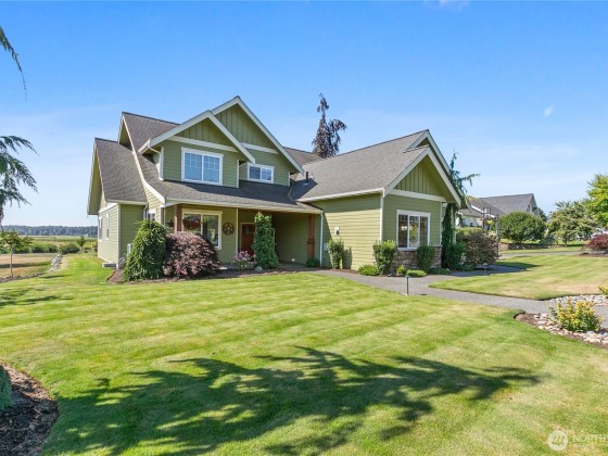 Fantastic Lynden opportunity! Peaceful and private location w/ creek frontage on the edge of town. South facing mountain, pond and sweeping valley views! This thoughtfully designed home features 5 bedrooms, 2.5 baths, an office, and spacious bonus room. The main-level primary suite includes patio access, jetted tub, marble tile, and walk-in closet. Open-concept living with vaulted ceilings and tall windows which fills the space with light. The home features, hardwood floors, stainless appliances, no-step entry, oversized 2-car garage, and generous storage throughout. Enjoy watching the cattle graze and wildlife from the private large covered back patio. Beautifully maintained landscaping incl. accent lighting and in ground sprinkler system.