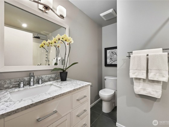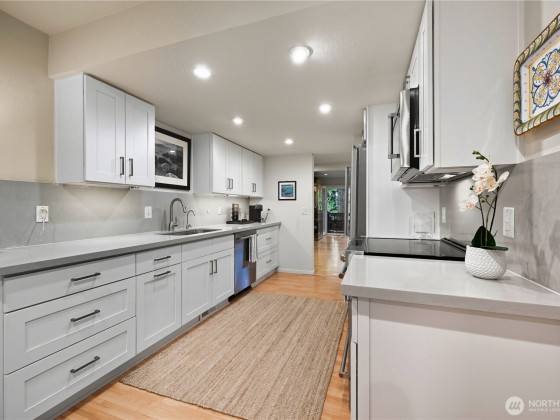 Come home to quiet luxury in this stunningly-remodeled end unit in Chambery Park! Not a single detail has been missed in this elegant home. Sleek kitchen with Kitchen-Aid appliances, ample storage, filtered water on tap, quartz countertops. Great room w/ dining area, wood-burning fireplace, vaulted ceilings & huge newer dbl paned windows & slider. Upstairs find a lg stylish primary suite w/stunning ensuite bath w/heated floors. Second bed down the hall, remodeled full bath in between, & a perfect office space just outside for WFH. Lt Rail 1/2 mi! Manicured grounds w/ mature landscaping, walking paths, outdoor pool, clubhouse, Pball/tennis/Bball court, fitness room w/hot tub, gated entry & 2 parking spots all make this your perfect new home.