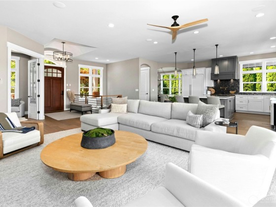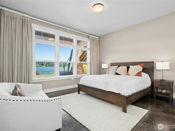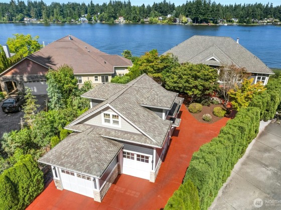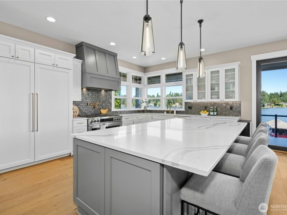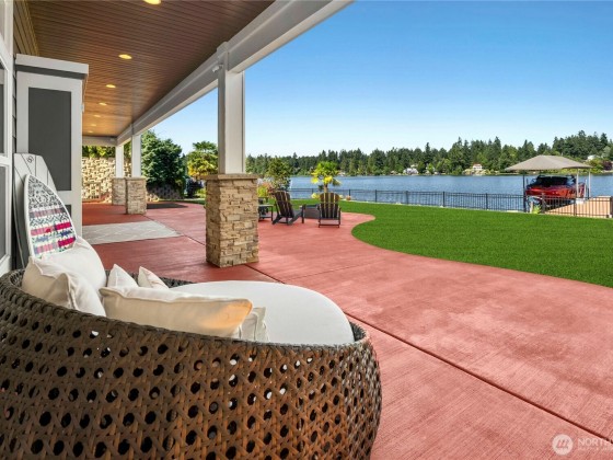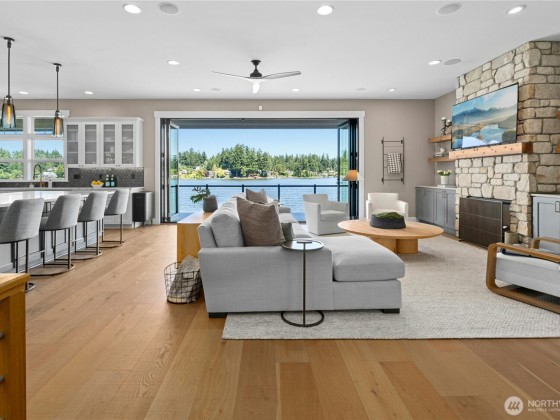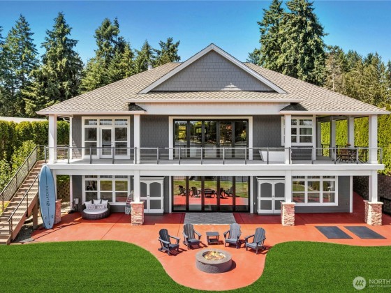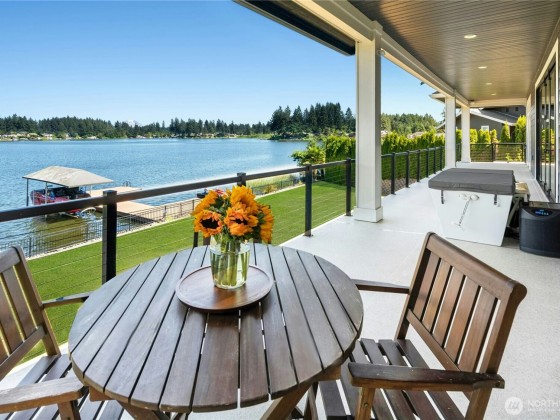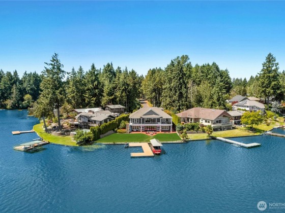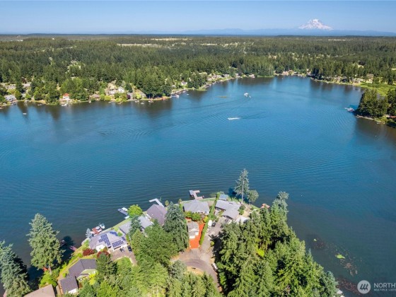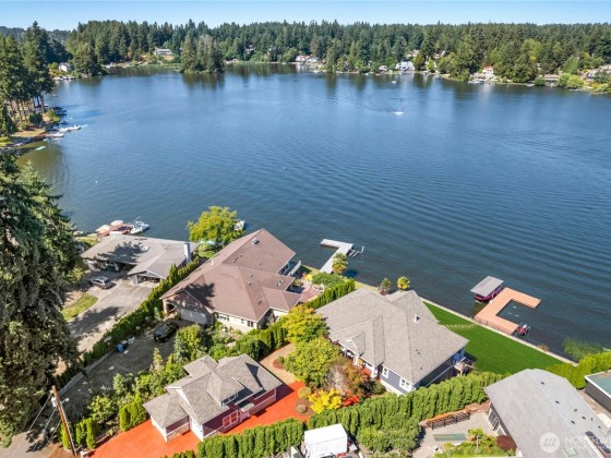 Come discover the most desirable property on Long Lake, offering breathtaking Mt. Rainier views throughout & serene wrap-around porches. This luxurious waterfront home has been lovingly remodeled with high-end custom finishes, stunning hardwood floors, Restoration Hardware lighting & top of the line appliances. Enjoy seamless true indoor-outdoor living year-round with gorgeous Nano walls on both levels. Main-floor primary suite includes spa-like bath & downstairs an impressive rec room area flows to your outdoor paradise w/110 feet of level lakefront, custom dock with 10,000 lb boat lift & gas fire pit for your s'mores. Bonus ADU w/private entrance & kitchen above your 3-car garage adds guest or rental potential. RARE lakeside perfection!