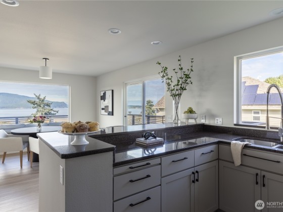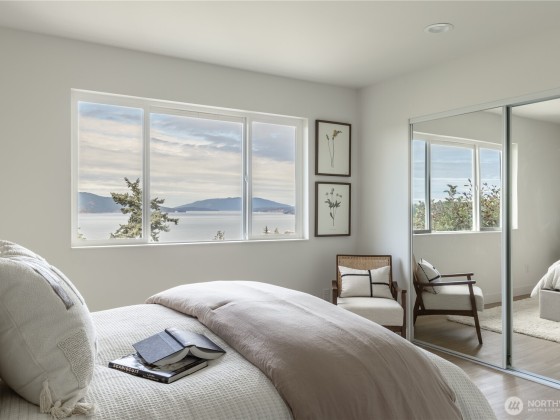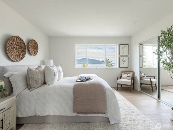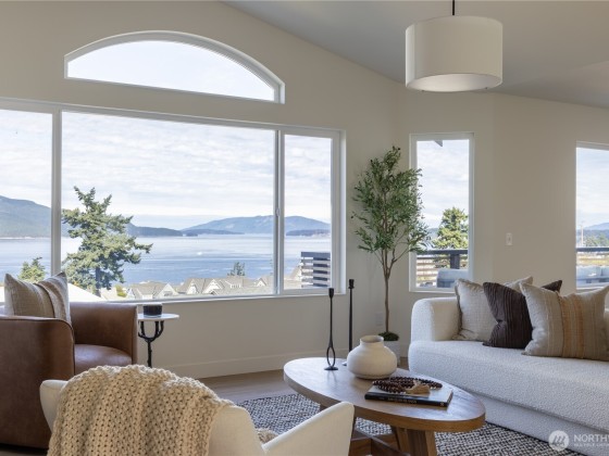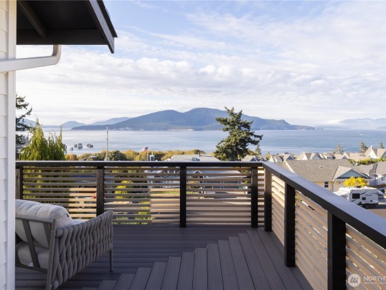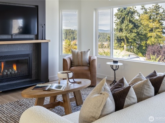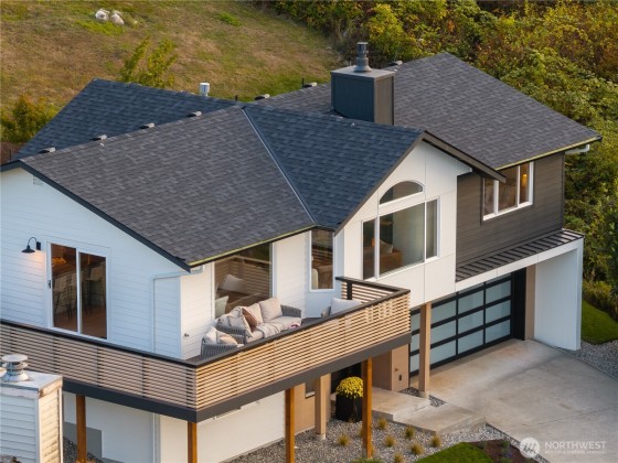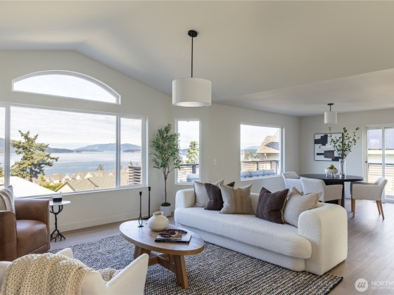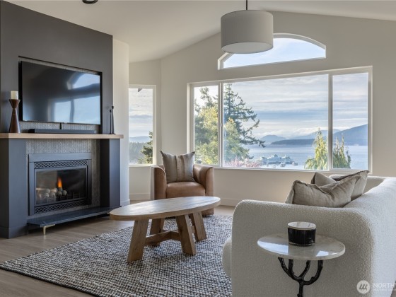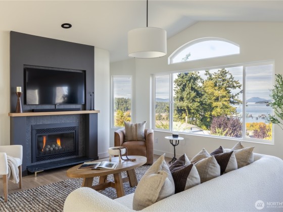 Move-in ready, refined & crafted for effortless luxury in the heart of Anacortes, this masterfully reimagined Contemporary NW home showcases sweeping Guemes Channel & WA State Ferries views. Meticulously renovated from top to bottom, this property blends timeless design w/low-maintenance living. Exterior features a brand-new roof, Hardie + cedar siding, seamless gutters, Milgard windows, custom Fiberon deck designed for years of enjoyment. Inside, light-filled living spaces highlight vaulted ceilings, showpiece fireplace wall, chef’s kitchen w/granite & premium Samsung appliances. Spa-like primary suite offers Carrara marble bath w/rainfall shower, body jets, dual vanity. Smart home tech, premium flooring & high-quality finishes throughout.