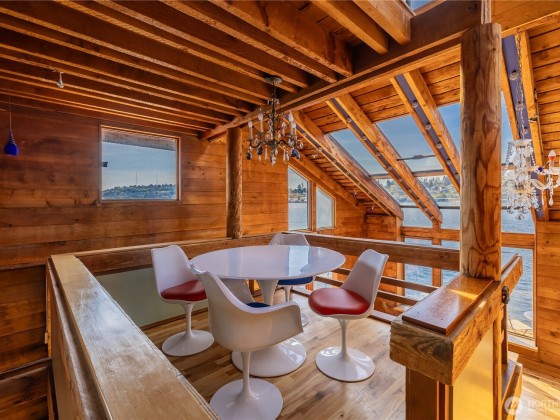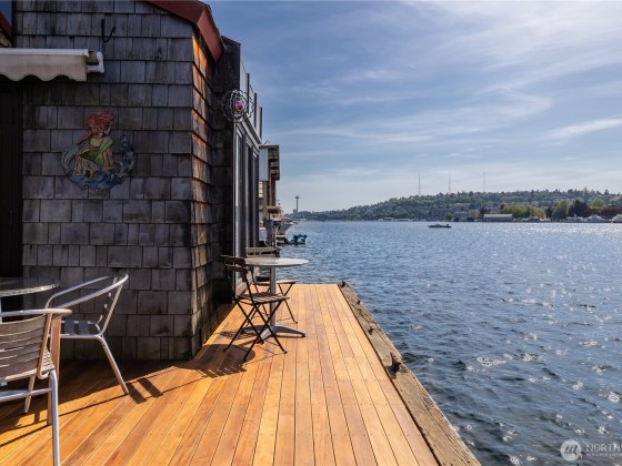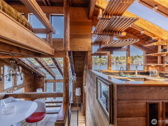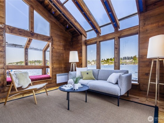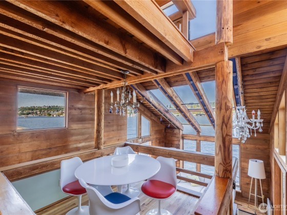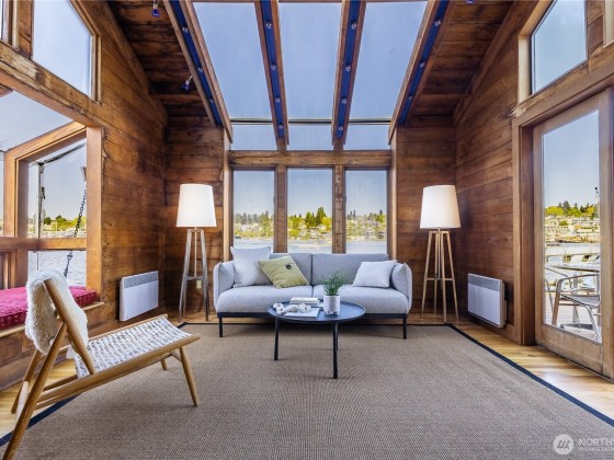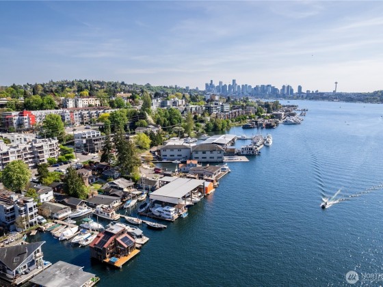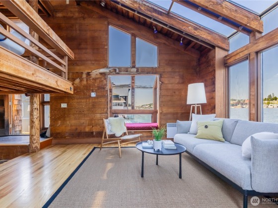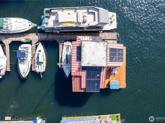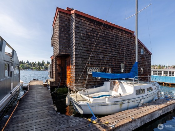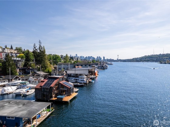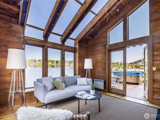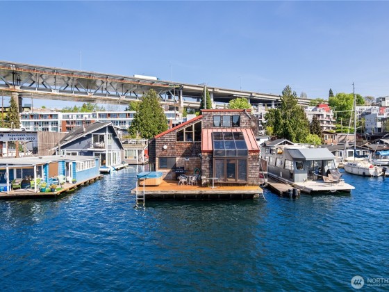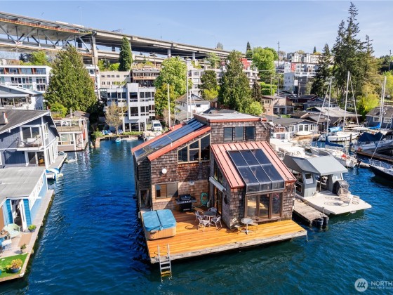 Quite literally the coolest floating home on Lake Union & of course it's end of dock. Condo dock + boat slip & parking. Soaring high above lake w/ views of city, Space Needle & mountains,this one of a kind home by renowned architect Jessup was featured in multiple publications. Lives like a floating treehouse & long admired by the passing boat parade for it's whimsy & beauty. Three bedrooms including primary suite, office/den, & bonus room. Dining room is mid level & a hub, while living room has cozy sunken space for movie night. Deck is newer & you can tie a boat up in front & in private slip behind home + hot tub! Sellers have lived here for many years & recently purchased home's condo slip for $1.5M so that you can own the moorage,too!