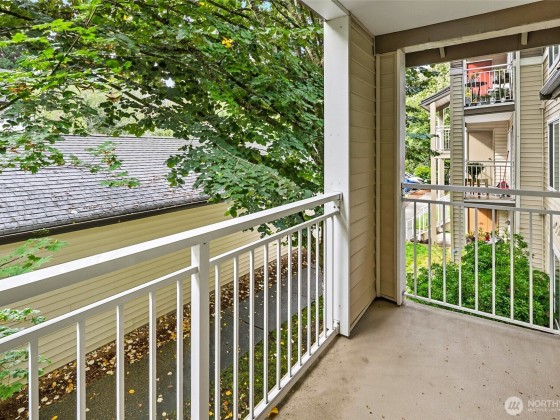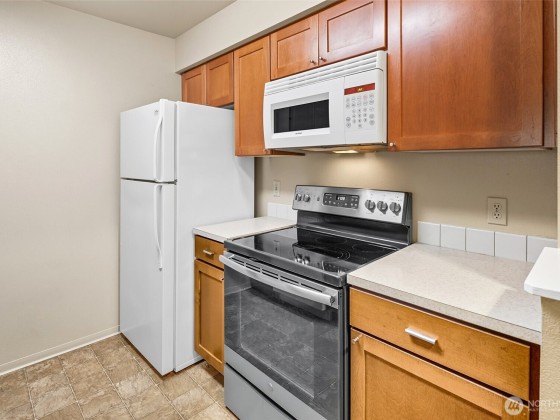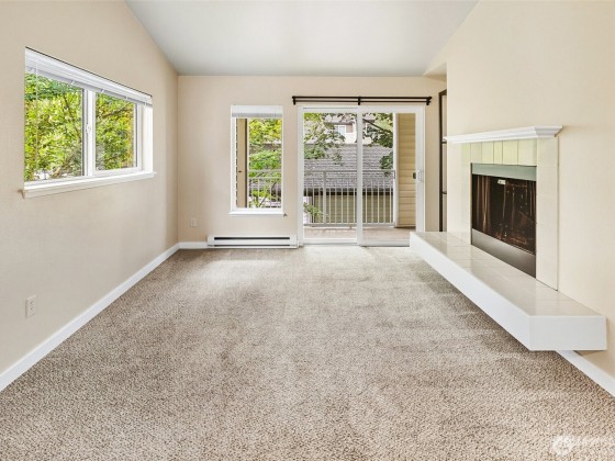 Welcome to your top-floor condo in the highly coveted Front 9 condos! This one bedroom, one bathroom open floor plan unit with its own covered parking spot right next to the unit! Bright, open living space with vaulted ceilings and a real wood-burning fireplace, seamlessly connected to the kitchen with a separate dining area. Large one bedroom with ample closet space and full primary bathroom with full sized washer and dryer! Well maintained and move-in ready! Ample amenities such as an indoor and outdoor pool, game room, gym, basketball court, clubhouse and community areas. The reserved parking spot is conveniently steps from the unit. Minutes away from the ferry, Boeing and freeways.