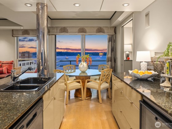 Exceptional SW-corner residence in the renowned WATERMARK TOWER with sweeping views of Mt. Rainier, Elliott Bay, the Olympics, the Great Wheel, the city skyline & the new waterfront promenade. A rare opportunity, this expansive retreat combines 2 premier units into one with 2 kitchens, 3 BR, 3.75 BA & 3 private view decks. Flexible floorplan with dual entrances offers ideal separation for multi-gen living, guests, or MIL. Refined interiors feature slab granite, SS appliances, hardwoods, custom built-ins & gallery lighting. Amenities include a reimagined Art Deco–style lobby, fitness center, sauna, rooftop deck, clubroom, storage & secure parking- all in the heart of downtown, just steps to Pike Place Market, ferries, dining & entertainment.