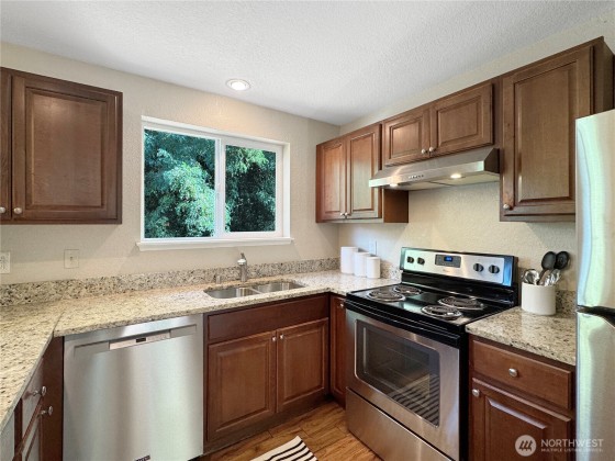 Your dream home awaits! This stunning 3BD/2BA + loft/den split-level offers 1,890 sq ft of stylish living. Recent updates include new carpet in bedrooms (2025), Hardy Board siding & windows (2019), furnace (2019) & water heater (2023) for peace of mind. The loft is ideal for a home office, while the kitchen shines with SS appliances, granite counters & a huge eat-up bar—an entertainer’s dream! Gather around the cozy wood-burning fireplace, relax in the upper-level bath w/ custom tile & dual access from hall & primary, or enjoy the 2nd updated bath off the spacious lower-level family room & 3rd bedroom. Step outside to a private backyard oasis with paver patio. Close to schools, shopping, Boeing & freeways—bright, modern & move-in ready!