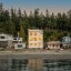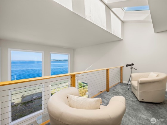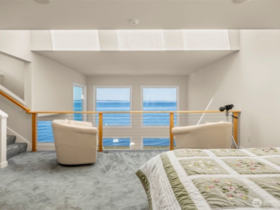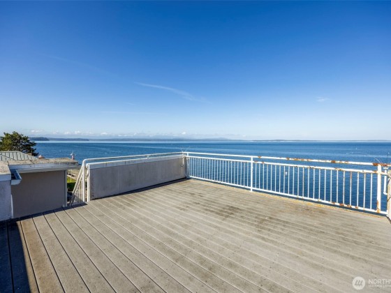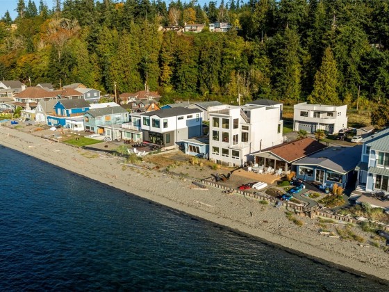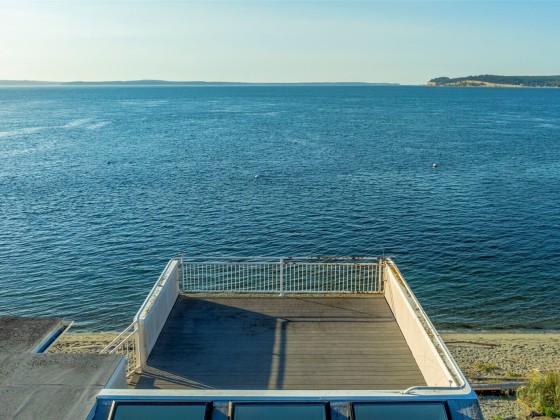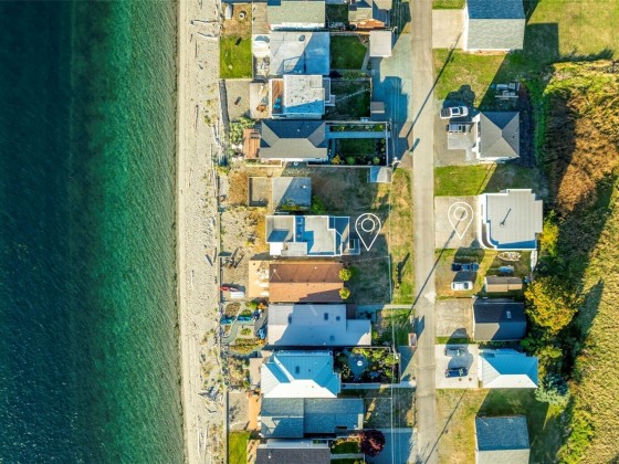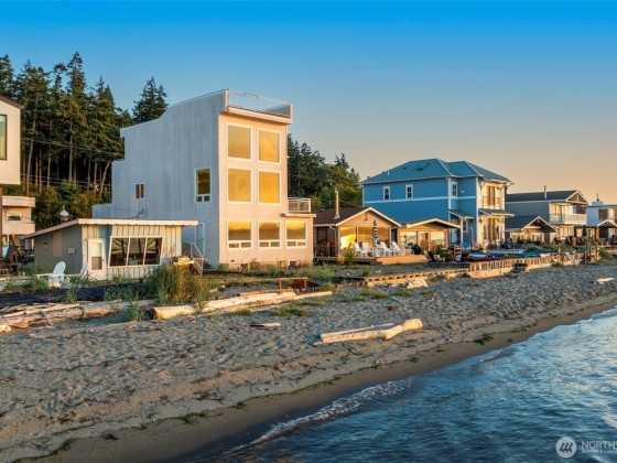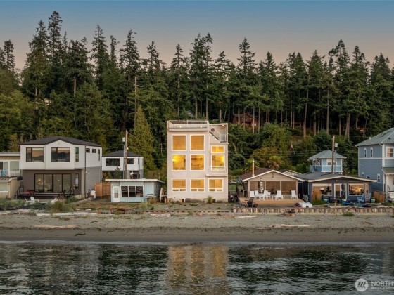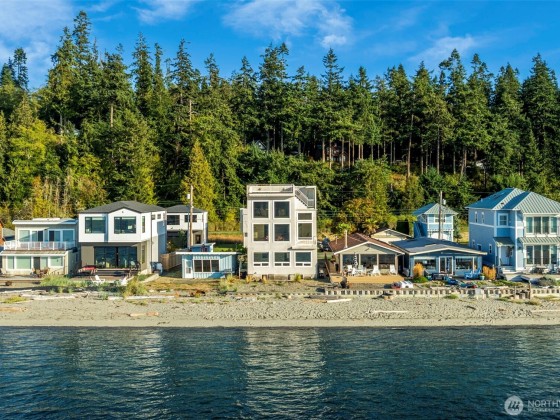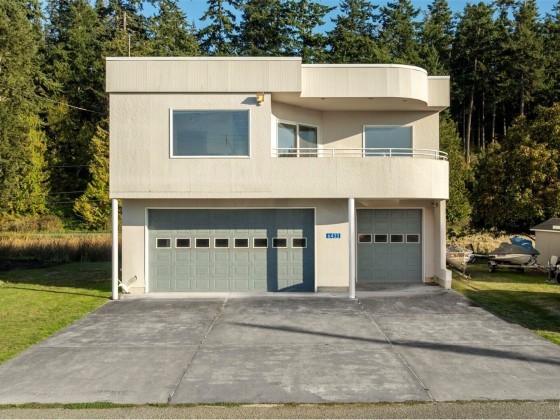 Indulge in the luxurious tranquility of beachfront living at stunning Mutiny Bay. Experience the ultimate coastal lifestyle with beachcombing, boating, and fishing right from your doorstep. This expansive, light-filled residence offers three levels of sophisticated living, crowned with a rooftop deck and complemented by a detached guest house and garage/shop. Main level living with a primary suite upstairs and a spacious lower level. Admire breathtaking sunsets, mountain vistas, and the vibrant marine life and shipping lanes. The guest house boasts a 3-bay garage and shop with a generous apartment above, providing both storage and separate living quarters, rare for beach houses. Includes one covered boathouse berth. Property sold "as is."