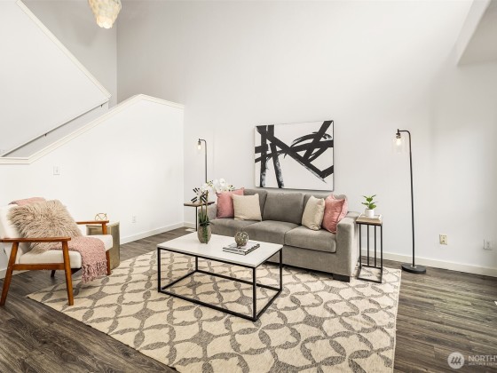 Step into this reimagined Rosemount townhouse where style, comfort, and convenience meet. The main level features soaring vaulted ceilings, a cozy gas fireplace, and abundant natural light from south-facing windows. A chef’s kitchen with quartz counters, high-end stainless appliances, and generous storage opens seamlessly to a formal dining area, deck, and fully fenced yard with low-maintenance astroturf—ideal for entertaining. A powder room and full laundry complete the level. Upstairs, the luxurious primary suite boasts a spa-like 5-piece bath and walk-in closet, joined by two spacious bedrooms and full bath. With a 2-car garage, central heating/cooling, and prime I-5 access, this home blends elegance with everyday ease.