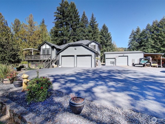Exquisite home on nearly 4 park-like acres tucked into the Kelso hills. This stunning multi level home begins with a beautifully vaulted great room that leads to the kitchen & to the sprawling deck over looking the forest, trails, creek and pond areas. Upper level offers an oversized primary suite with fully updated bath and walk-in closet. Second level houses two bedrooms, full bath and laundry/mudroom leading out to a huge two bay garage. Lower level features a bonus room, utility and storage along with family room leading to the patio & lower yard. Fruit trees, garden and gorgeous landscaping. Huge custom shop for all the toys you bring along! 5 minutes to I5 and just 50 minutes to PDX. Make this stunning property your new home!