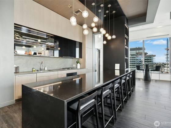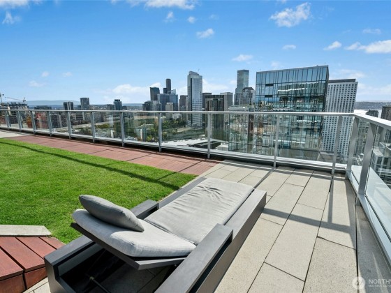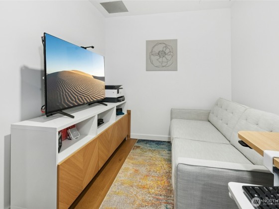 Luxury living at NEXUS: 1BR + Den with rare Mt. Rainier views! This bright unit features floor to ceiling windows, quartz countertops, hardwood floors, A/C & smart home system. The sleek kitchen includes a stainless-steel oven, Grohe fixtures, and wood-paneled built-in appliances. Upgrades add convenience with motorized solar shades in living room, blackout shades in bedroom, pull-out kitchen drawers & under-sink bins. The spacious bedroom offers an ensuite bath and walk-in closet, while the den provides flexible space for work or guests. Enjoy amenities including 24/7 concierge, dining rooms, co-working lounges, fitness center, theatre, Sky Club rooftop, outdoor spaces & a dog run with wash station. Large parking and storage are included!!