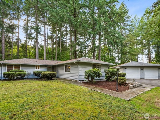 Charming 3BR, 1-story cottage on just over an acre in a desirable and growing Lacey community! Hardwood floors, 2 spacious living areas & a cozy wood-burning fireplace bring warmth & character. Enjoy a park-like setting with fenced yard and mature trees, patio & privacy on a private dead-end street. A huge detached 2-car garage offers endless potential—use for parking, storage, or convert to extra living space. Zoned moderate density, this property is perfect for owner-occupancy, income potential, or future development. Property has been well maintained with newer roof, exterior paint and attractive landscaping. A rare find with endless opportunities! AMAZING!