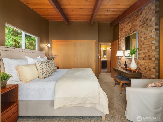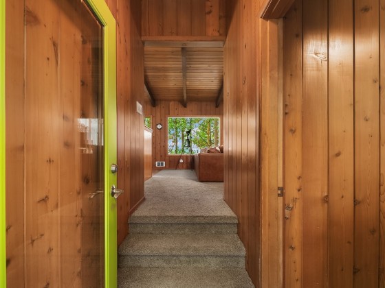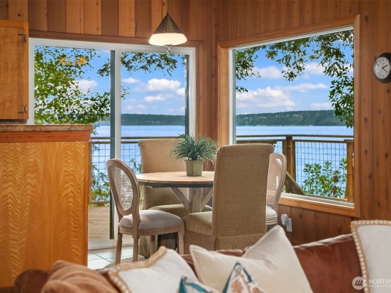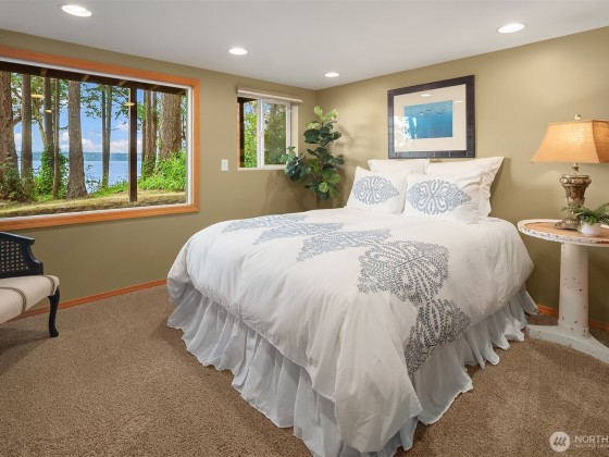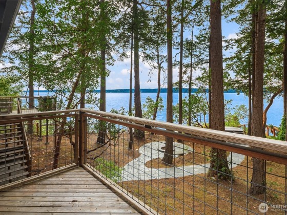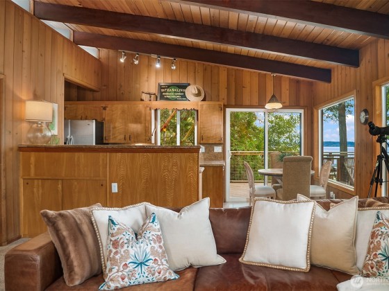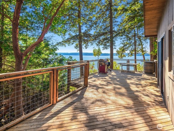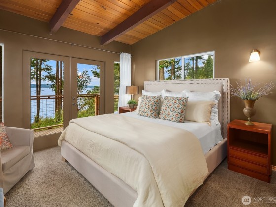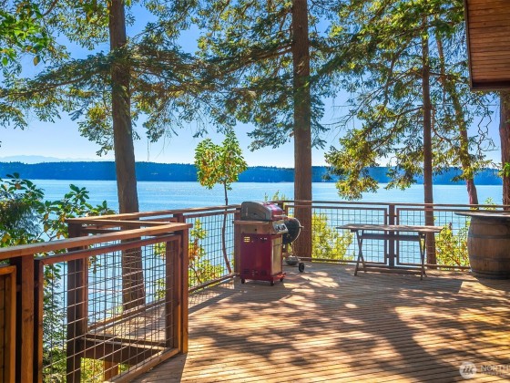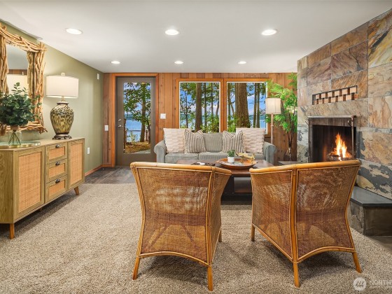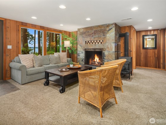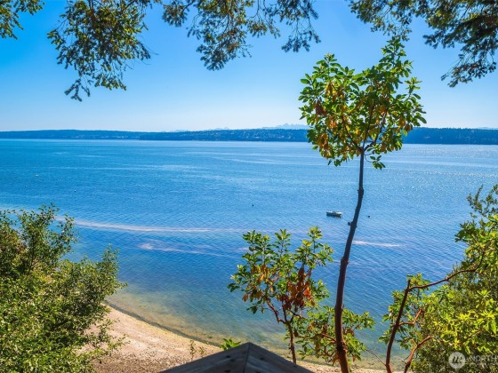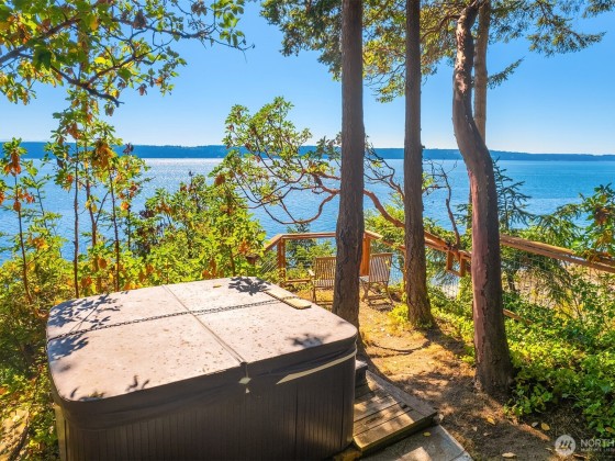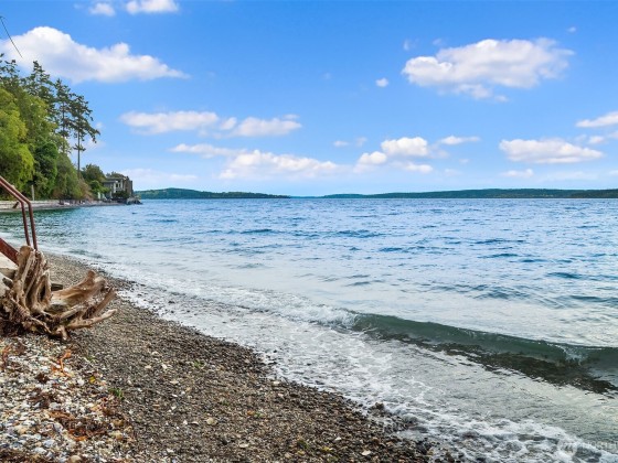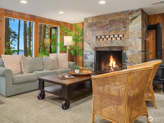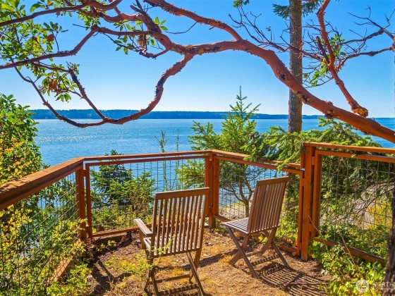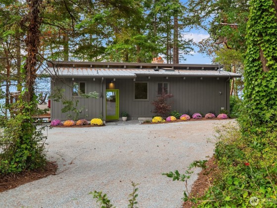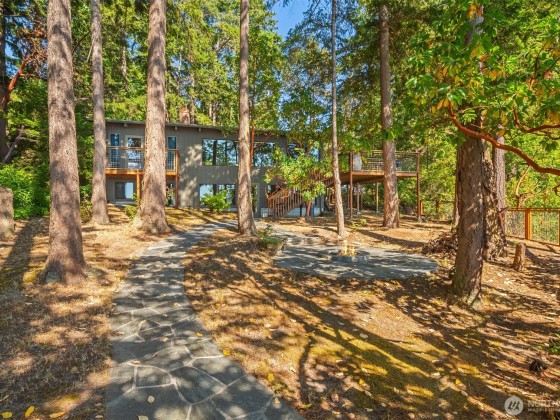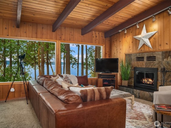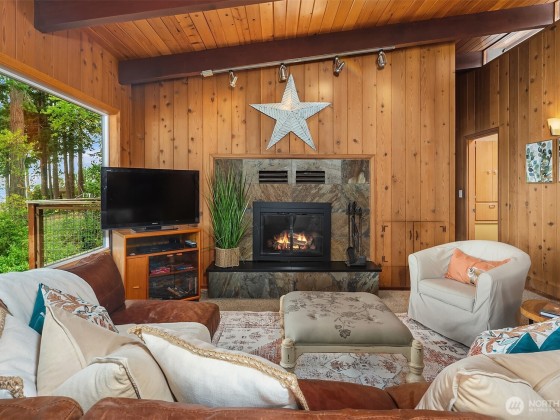 This medium bank waterfront on Camano’s west side has a true retreat feel, with panoramic views of Saratoga Passage, the Olympics, and stunning sunsets. Watch eagles, marine life, and boat traffic. Surrounded by incredible Madrona Trees and shady evergreens, the back lawn paradise offers stone walkways, patios, and a fire-pit. Wood decks off the kitchen and primary suite feature coordinated custom railings. A mid-century modern with signature Camano flair—wood-clad ceilings, warm finishes, and timeless design. Main floor includes primary bedroom, guest room/office, and bath along with living area, fireplace, kitchen and laundry; daylight basement adds family room, two guest rooms, bath, and storage. Easy trail walk to the beach!