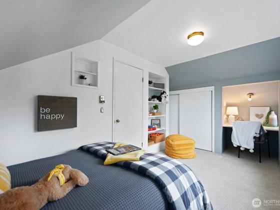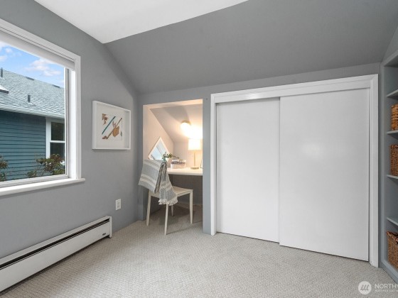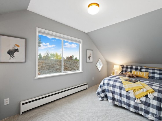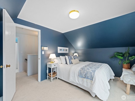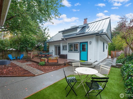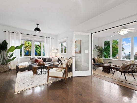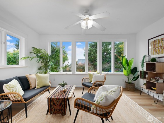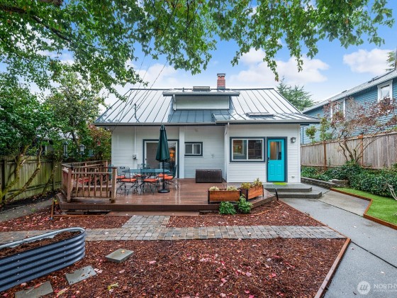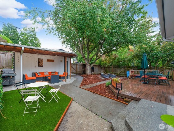 Delightful Craftsman style home in the heart of the Seaview neighborhood.Enchanting sun room entry with French doors and peek views, open living/dining room with tall ceilings, big windows, hardwoods, great entertaining space. Updated kitchen has Viking range, butcher block countertop & plenty of cabinets. Mudroom leads to spacious deck in private, fenced back yard. Main level den or 4th bedroom with 3/4 bath & sliders to deck, a great guest suite! Freshly carpeted upstairs has 3 bedrooms including primary with private deck & sweet Sound views. Full bath serves this level. Unfinished basement is utility, laundry & storage. Gas heat & hot water. Garage currently used as climbing gym/shop could be converted. Wonderful location & neighborhood!