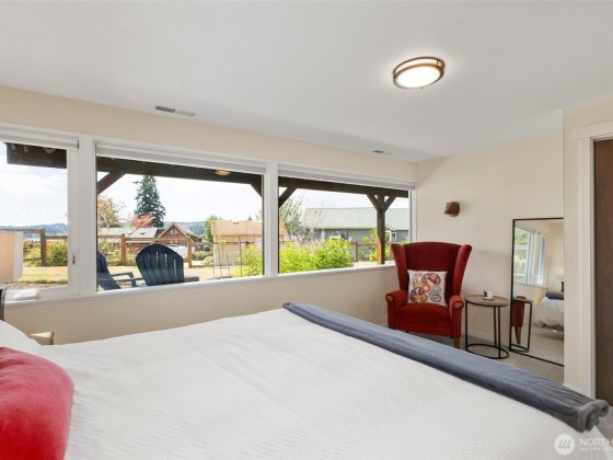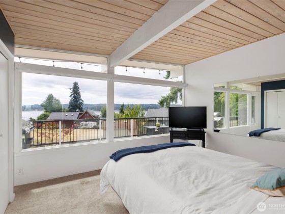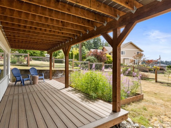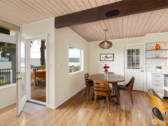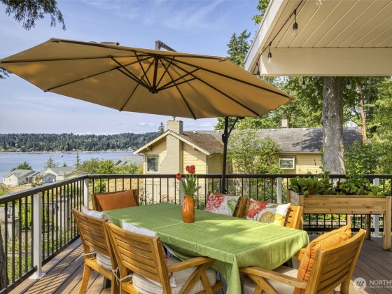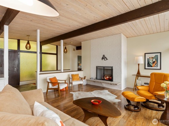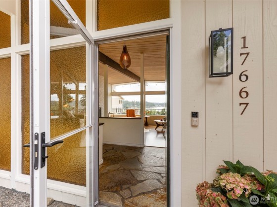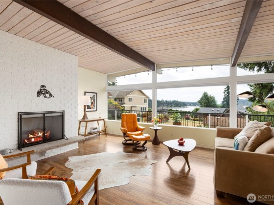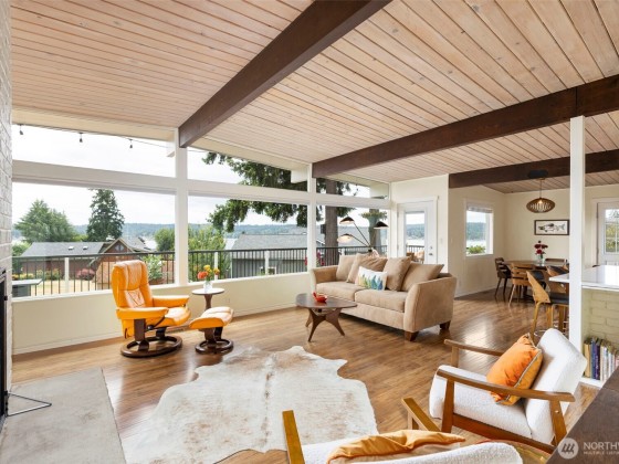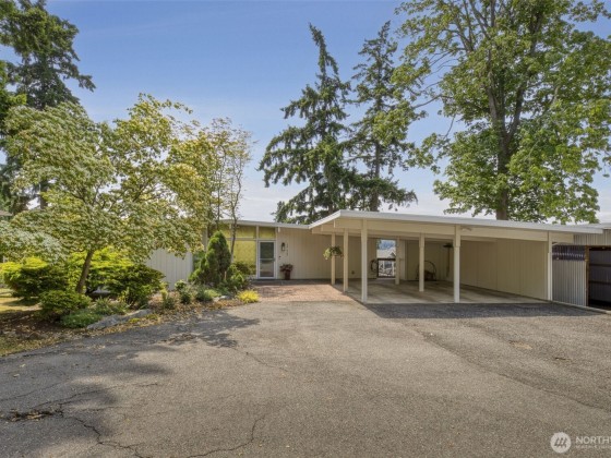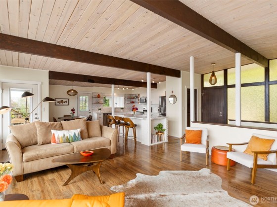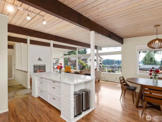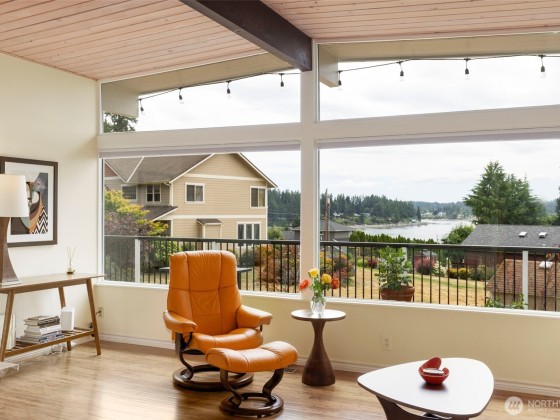 Set back from the road for peace and privacy, this beautifully updated mid-century modern Poulsbo home captures sweeping views of Liberty Bay, the Olympic Mountains, and even Mt. Rainier. Thoughtfully blending retro charm with modern upgrades, it features quartz countertops, custom soft-close cabinetry, new appliances, flooring, and windows. The 3BD/2.5BA layout includes a serene primary suite with a fully remodeled bath, spacious lower-level family room, office/den (vacation rental potential), and refreshed fireplaces. Enjoy the new composite deck, fenced yard, and workshop/storage spaces. Recent updates include a Mitsubishi heat pump, roof resealing, and new washer. Minutes to town & the Bainbridge ferry—ideal commuter location!