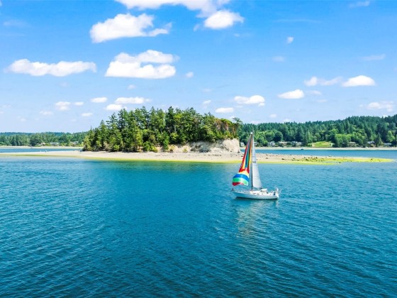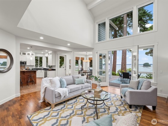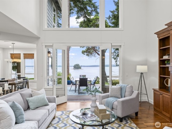 Cradled in old growth evergreens and kissed by the sea breeze on beloved Raft Island, this timeless waterfront Craftsman feels like a peaceful escape—yet it’s home. Incredible southern views of Henderson Bay and Cutts Island fill each space with beauty, light, and calm. The soaring great room, French doors that bring the outdoors in, and natural wood tones define the home's warm, comfortably elegant style. Thoughtful main-level living, includes a view-filled primary suite, office and the expansive deck. You'll love the charming original cabin, now an ADU. Stairs lead to your 85 ft beachfront, perfect for quiet walks or salty adventures. Just 6 miles from the heart of Gig Harbor, Raft Island life feels worlds away like a vacation each day