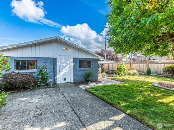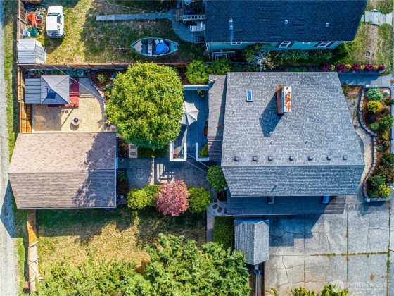 Mid-Century Modern with a twist, there's an attached studio with a half bath and a ground level entrance. Was used as an in-home business, could be converted to an ADU. Main house features classic MCM features such as dramatic vaulted ceilings, including the two upper bedrooms, hardwood floors, big windows that let in lots of light, and a great flow. Lower level has a large bedroom w/ 1/2 bath & fireplace. Newer gas furnace & water tank, updated piping, updated bathrooms & plenty of storage. Peaceful backyard is fenced, has a gazebo and a 2-car garage. The parking pad in front of the house and the small blue shed belong to the parcel to the north, which is for sale separately, land mls#2439089 Buyer to verify all info to their satisfaction.